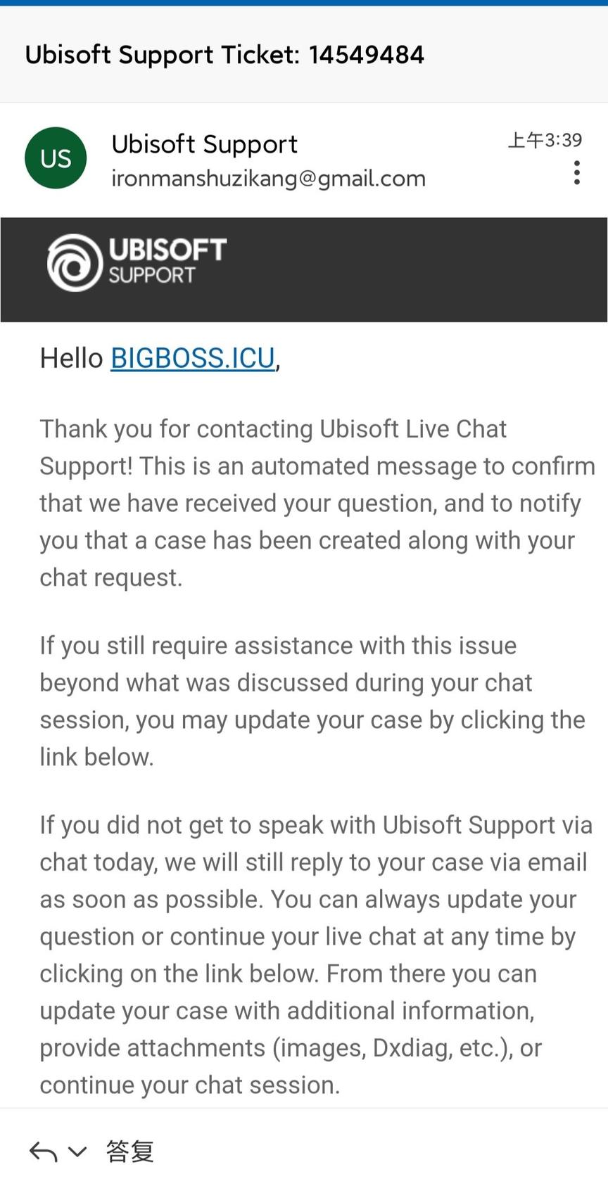 最后点击发送后,你的育碧账号使用的邮箱立即会收到一个工单号,等待进一步回复即可。