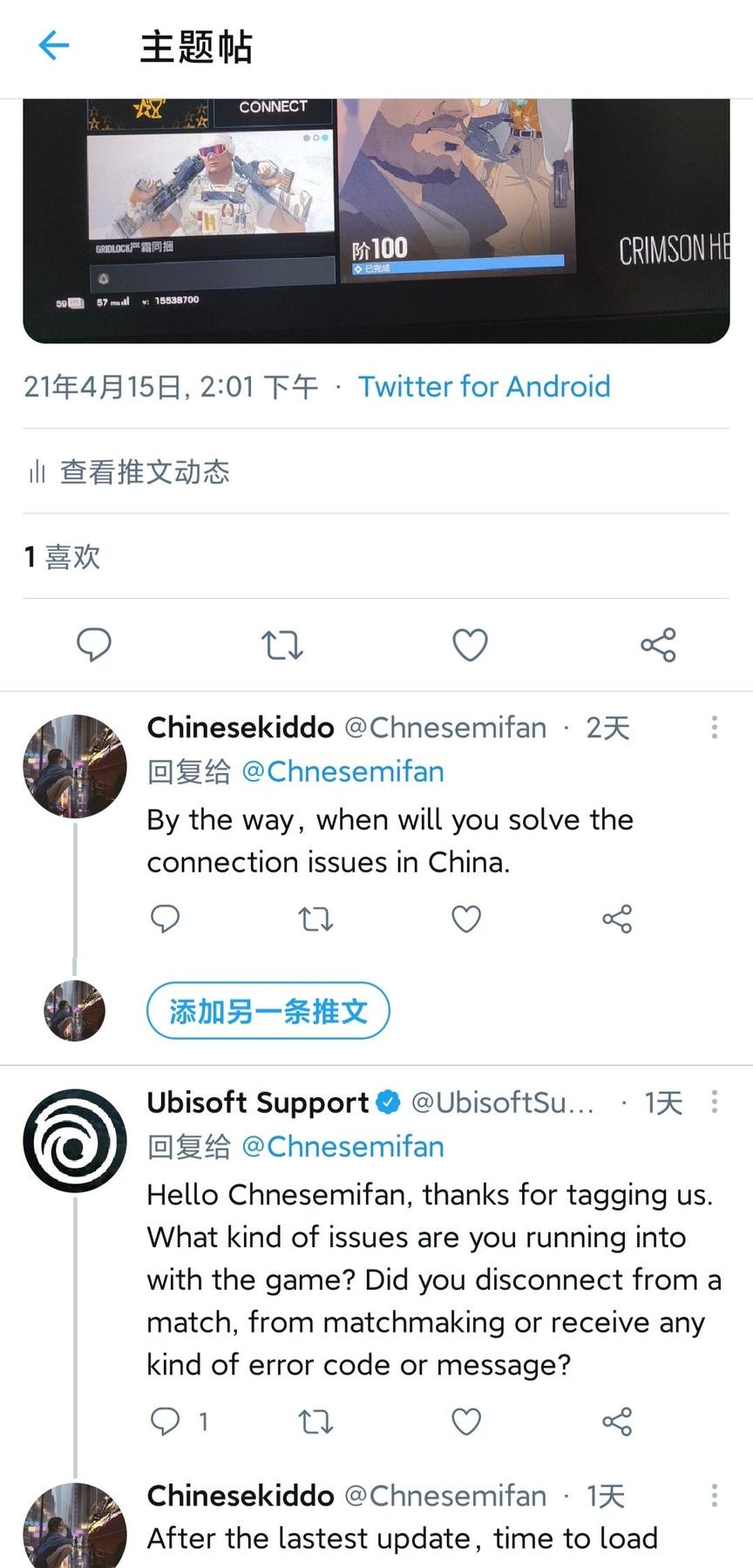 在推 特@Ubisoft support可以解决很多问题,他会指导你解决问题,但是大陆服务器问题还是算了,这个实在没办法。游戏相关问题只要提出的人多了就会有反馈。(比如被骂出来的愚人节活动包)