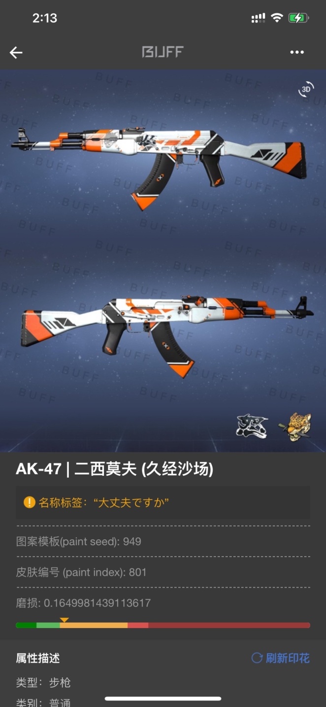 - 先来ak-47枪皮,一开始我买的二西莫夫,当时就随便选了把名字好听一些的 "大丈夫ですか" 意思是:没事吧? 用了一周就换掉了,值得一提的是这个贴纸很好看,怒 刮去一定次数之后就变成了 怂