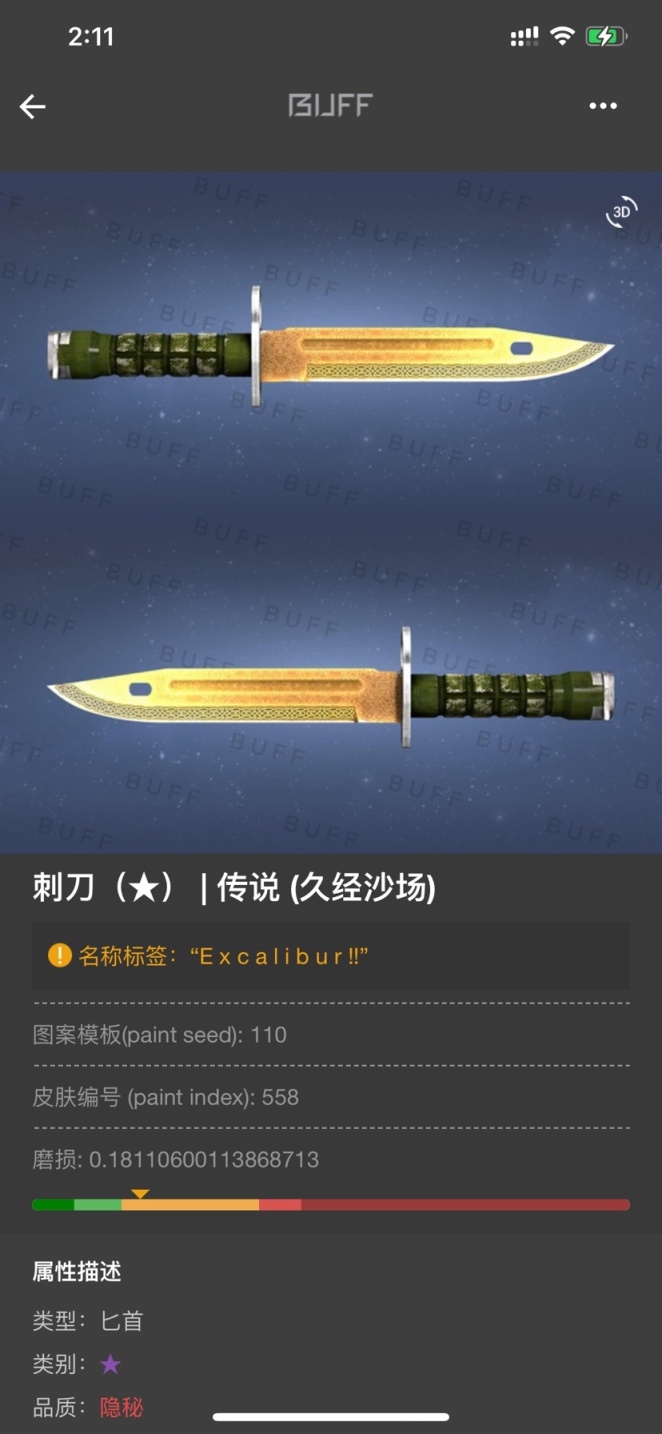 - 后来我又买了蓝色的手套(多边形)配合这把折叠刀刀尾蓝色的地方,因为手套没改名这边就不放图了。很快玩了一周手套就卖了,就想着警和匪各用一把刀嘛,就买了第三把刀刀,极限酒精传说刺刀,取名为 "Excalibur!!" 名字源自动漫:Fate系列 动漫中阿尔托莉雅的宝具咖喱棒名称所得,在开宝具的时候那一缕金光,感觉所有传说皮肤的刀都可以取这个名字。