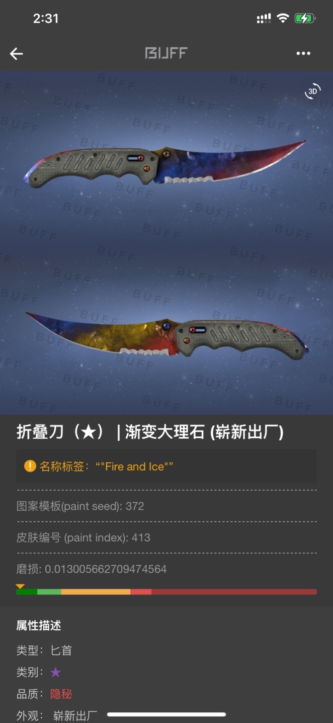 - 这把刀还给朋友之后,这每天打csgo啊,没个刀刀就很不习惯,于是自己趁着过年拿了压岁钱就买了把极限十档的冰火折叠,取名为. "Fire and Ice" 这个起名其实中规中矩了…也不是很二刺螈了