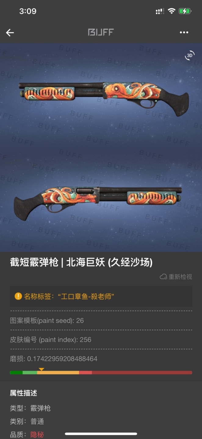 - 然后是这一把匪喷皮肤 截短 酒精 北海巨妖,相比宁静没有那么吃磨损了,极限酒精稍微不磨即可,改名为 "工口章鱼-殺老师" 源自动漫:暗杀教室(三年E班) 主要角色 杀老师,杀老师原型便是一个纯黄色满是触手的章鱼(?),所以感觉这改名超级贴合了。