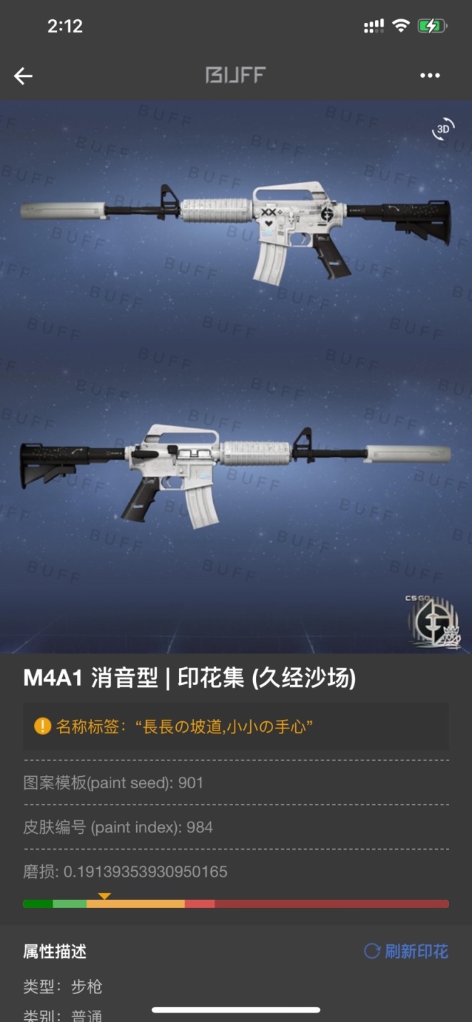 - m4第四个皮肤是前段时间换的a1 极限酒精 印花集,印花集系列是真的好看,也真的挺吃磨损,有机会换到极限略磨去,买来后的改名是 "長長の坡道,小小の手心" 源自动漫:Clannad,代表了爱情的开始-长长的坡道,以及代表了生命的继承-小小的手心,看过动漫的都懂。
