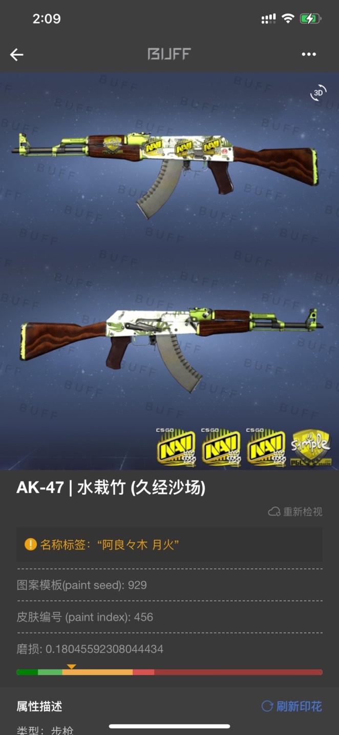 - 皇后这款皮肤陪伴了我好久,最近我才换成了 ak47 极限酒精 水栽竹 ,嗯……ak这边我算是终于在二刺螈的道路上走到尽头了,旭日收藏品yyds,这把枪改名挺让我头疼的,在我参考了无数buff在售改名之后选择了 "阿良々木 月火" 源自人物:物语系列中男主的妹妹之一 阿良良木月火 人物性格十分喜欢,再加上人物经常出场穿着和服,图案均为绿色蓝色,再有花朵点缀,也有水栽竹的图案意味,所以感觉很贴和了。