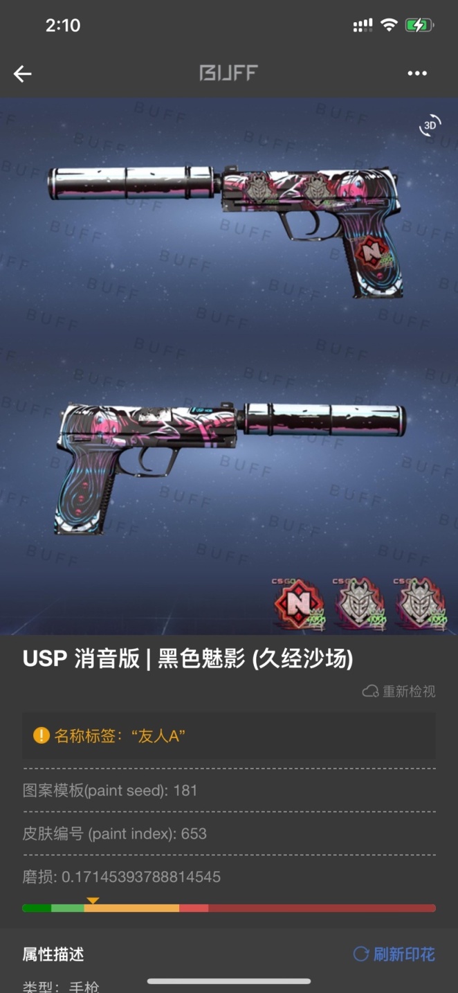 - 目前改了名字也用了很久的这一把就是 消音usp 黑色魅影,当时逛buff,看到这个改名我头脑一热就跑去发报价了……(死宅钱真好骗) 名称: "友人A" 源自动漫:四月是你的谎言 这个名称来自于动漫女主为了与男主相遇,撒谎说是陪朋友来的,将男主叫为友人A。樱花树下的那一个谎言,也是我们的开始。 皮肤风格嘛就是大姐姐了,超级高冷的,我愿当大姐姐的"友人A"!!