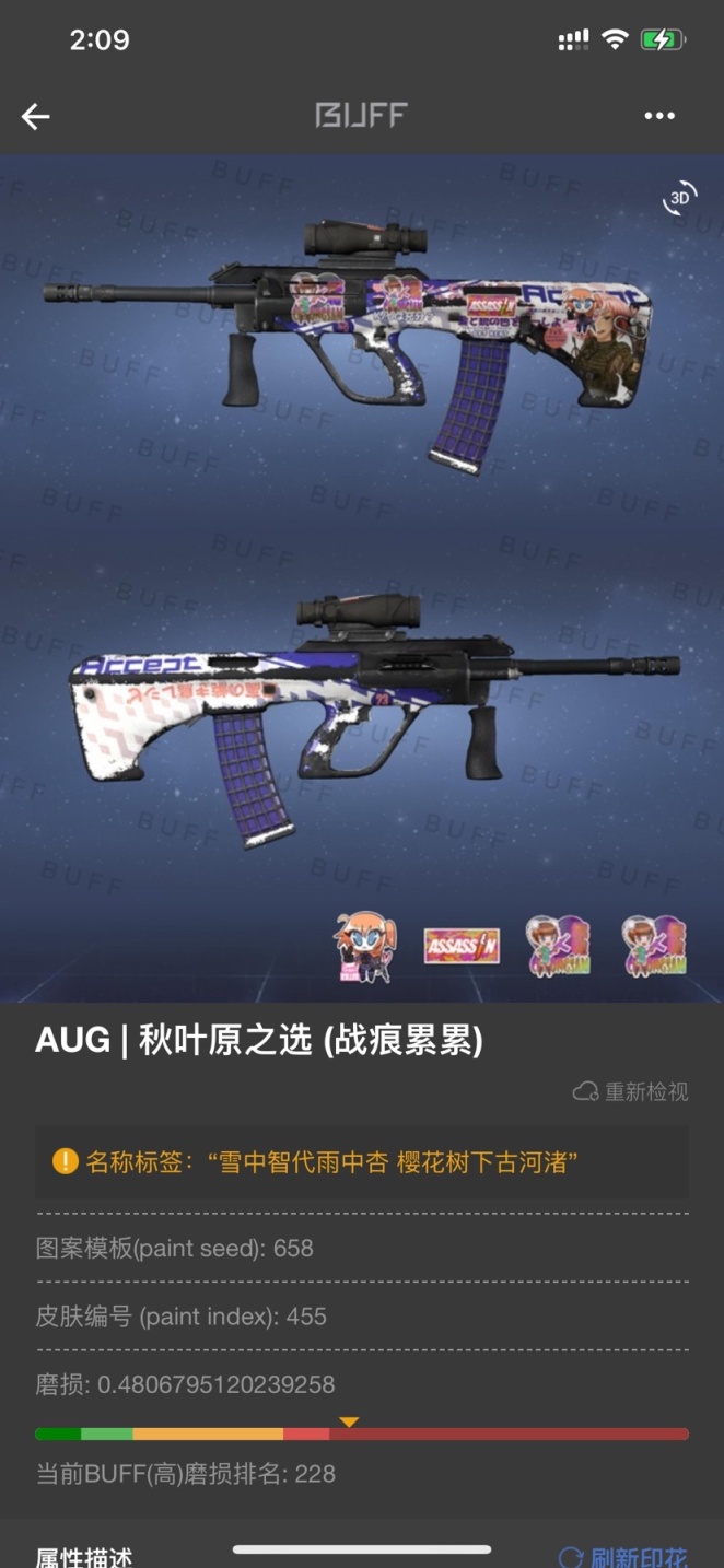 - 最后一把了,csgo死宅枪鼻祖,富有崭新秋叶原,专骗死宅钱美称的,aug-秋叶原之选,csgo死宅标杆之选,唯一缺点就是太贵了还死吃磨损……本人无法发动钞能力,只能入了把极限战痕的,这把枪买的好早,大概一两年前了,当时还每月拿着家里人固定的生活费过活,买完真就是痛并快乐着,改名为 "雪中智代雨中杏 樱花树下古河渚" 源自动漫:Clannad中被人广为流传的名句,智代,杏,古河渚均为重要角色,而雪中,雨中,樱花树下,均为非常重要的事件发生时间。我是打算有钱了一定要换崭新的!一定!