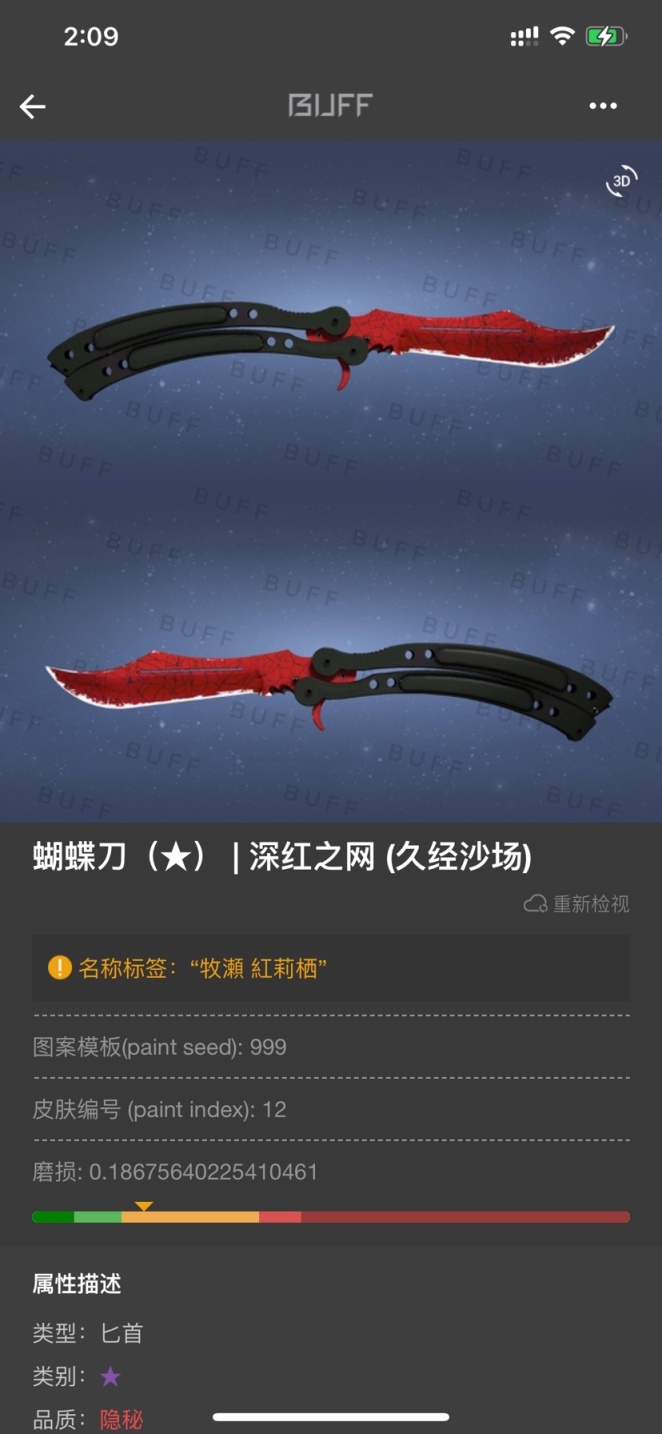 - 最近这两把刀都卖出去换了我的第四把刀刀 ,极限酒精 深红之网 蝴蝶刀,这皮肤真的很吃磨损,一定要极限磨损才好看一些,到手之后找了很久没看到中意的名字,突然间就想到了一个人物 "牧瀬 紅莉栖" 源自动漫:命运石之门 人物名字 可以说一头红发十分切合,不过还是很符合的是人物的气质,有时十分吵闹但极富理性,十分的傲娇但也如蝴蝶般的温柔。