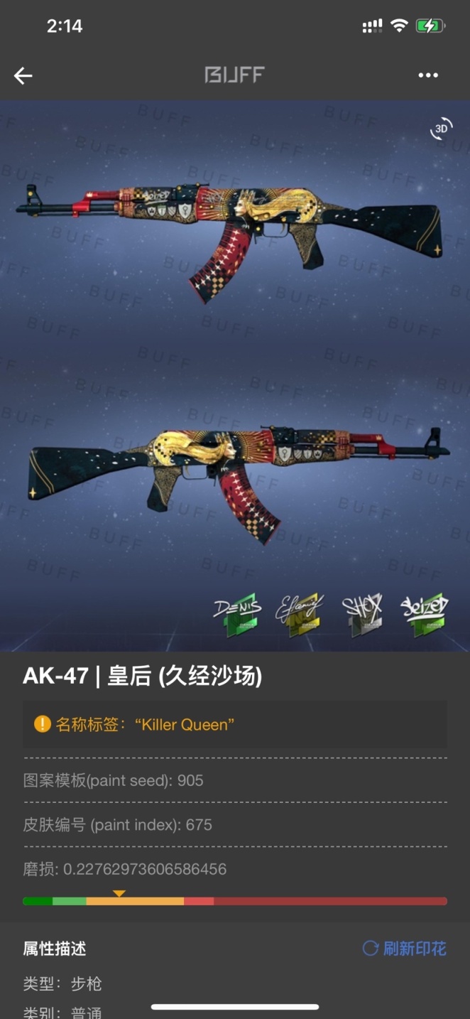 - 二西莫夫卖掉之后我换了把 酒精的皇后,这个皮肤不是很吃磨损的,酒精稍微高一些磨损就很亮了,我的改名是 "Killer Queen" 源自动漫:jojo的奇妙冒险 第四部 最终boss 吉良吉影的替身 杀手皇后