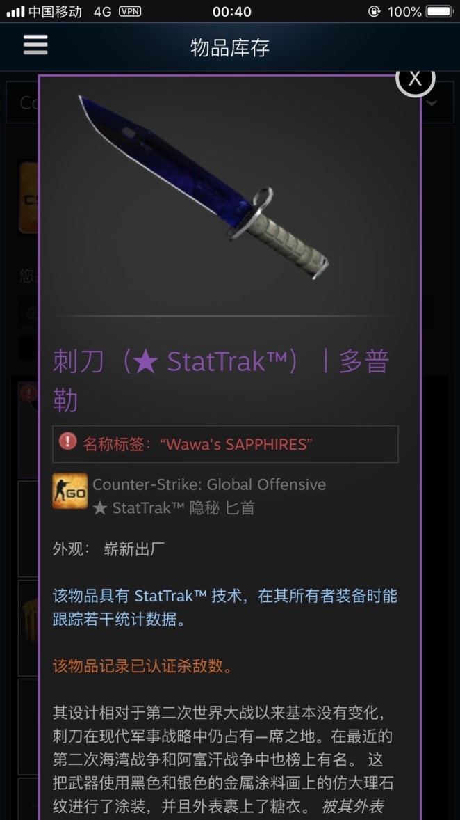 - 先从每天不离手的刀刀开始说起,这是我玩这款游戏第一次玩刀,当时是朋友借我玩一个礼拜,后来玩了整整半年……因为时间久远找不到具体的图了,这张是刚拿到手的截图,是很蓝的p4多普勒刺刀,我拿到手改名为 "空の境界" 名字源自动漫:空之境界 因为蓝色既有天空的颜色,shiki(两仪式)这角色我也超喜欢,蓝色的和服一直在身上真的很贴切了。