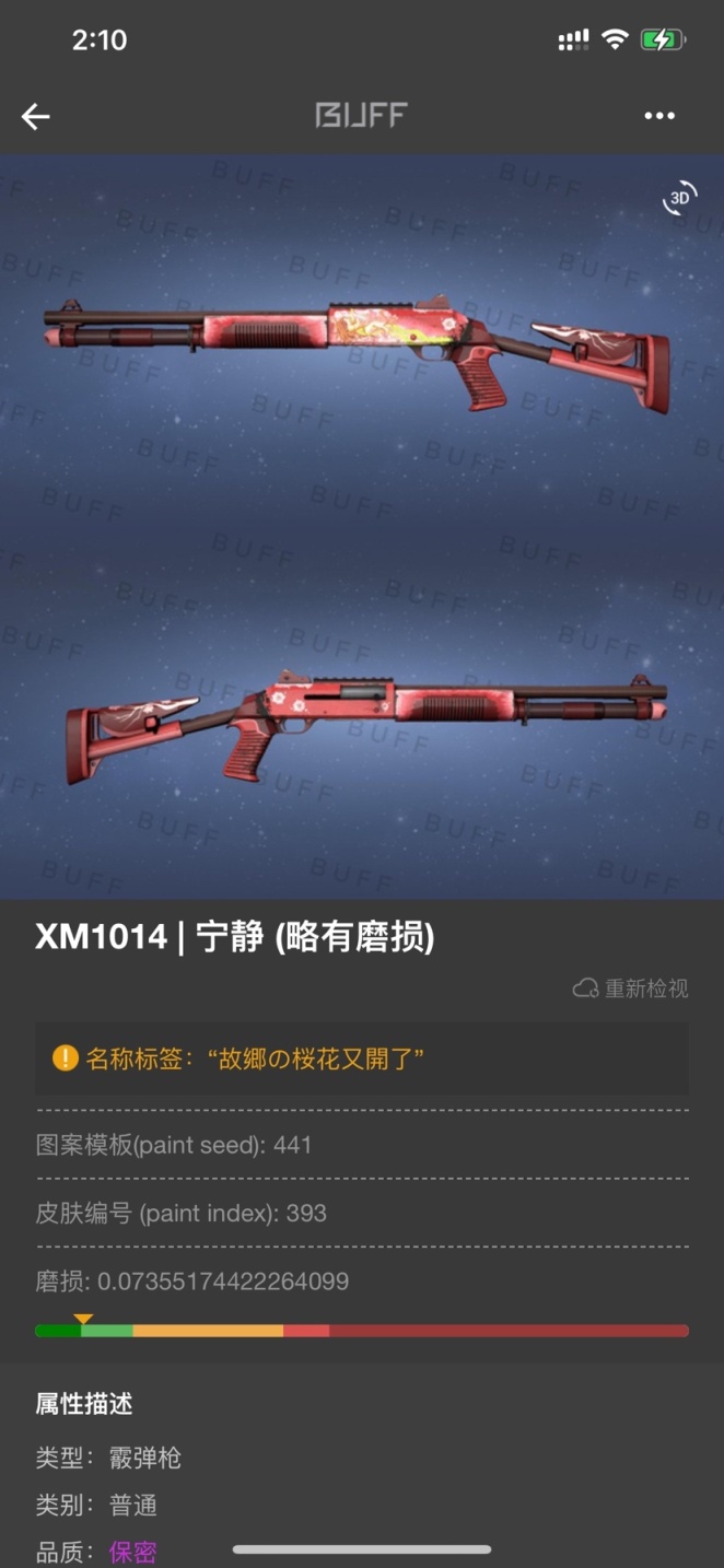 - 这里是我一直在用,没有换过的几个皮肤,第一个是1014 极限略磨 宁静 这把枪十分吃磨损,也十分的好看,不同磨损价格差距特高 改名 "故郷の桜花又開了" 源自梗:故乡的樱花开了 在这句话的基础上改为繁体再加个 の 这意境就出来了!