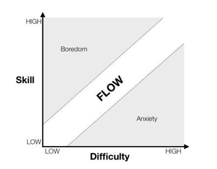难度是完全基于玩家的主观判断,我刚开始玩某个游戏,我并不知道这个游戏的难度设计基准是什么,那么我只会按我之前玩过的所有游戏的总体经验选择难度,比如我个人是会优先选择“普通”难度之上高一级的难度(《消逝的光芒》我开荒选择的是困难难度)。那么难度设计到底要怎么进行设计比较合理,游戏界有一个比较成熟的理论,即心流(flow)。