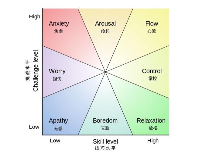 如果挑战程度中偏高,技巧水平却很低,我们会对这件事感到不同程度的焦虑;如果挑战水平中偏高,技巧水平偏中,同样会产生兴奋和紧张;而如果挑战程度偏低,技巧水平也中偏低,我们就会对这件事感到不同程度的无聊,当无聊自己又做不好的事,最容易让我们陷入一种“彻底的无感”里;相反,如果挑战水平中偏高,技巧水平偏高,我们就比较容易在做这件事的过程中进入心流。面对挑战,必须掌握足够的技巧——这个世界上大多数事都是刚做的时候觉得没意思,投入一定时间学习、练习之后才会觉得有意思,就是这个原因。这也使制作者在设计游戏时保持挑战水平和技巧水平在一个的同步的状态,尽量保持在“唤起”“掌控”“心流”这三个状态之中。