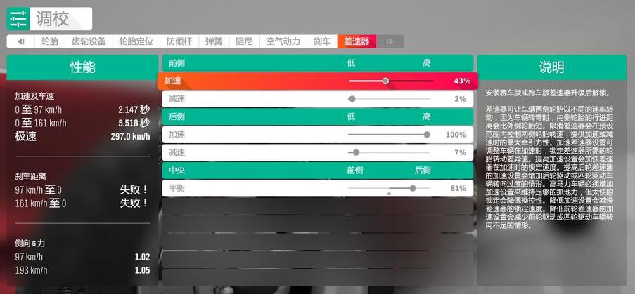 差速器的调校选项及对应影响为: