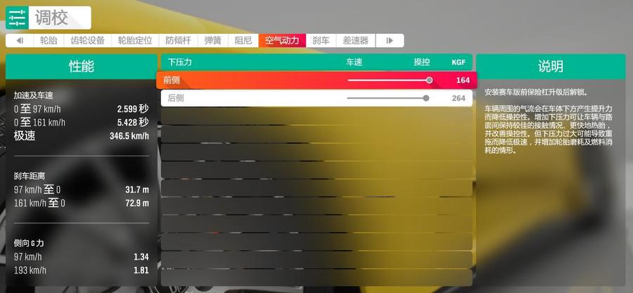 空气动力的调整目标在讲解“改装件”的时候已经给出。