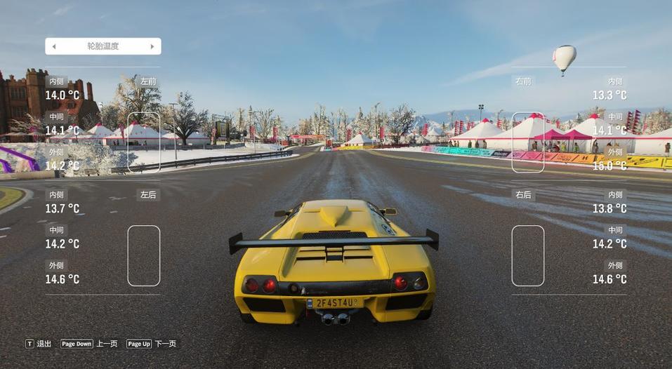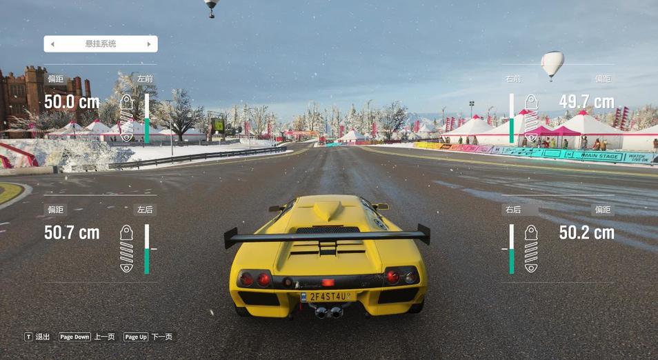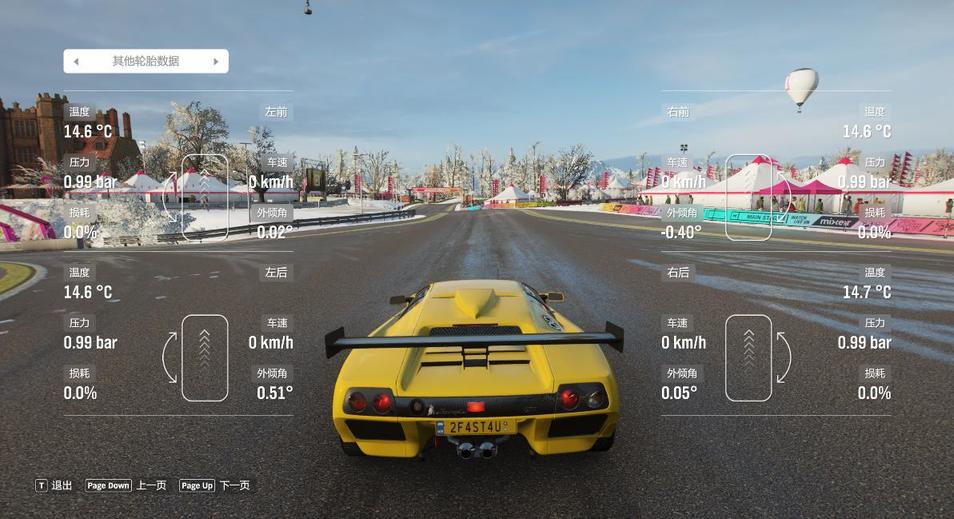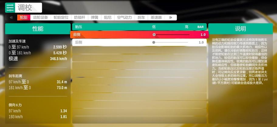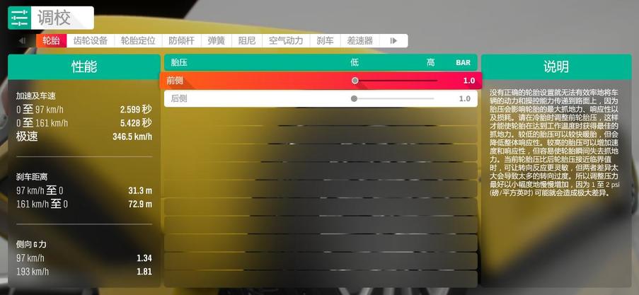 由于地平线4的赛道包含多种混合路面,前后胎压一般在1.0 - 1.8 BAR的范围内选择。