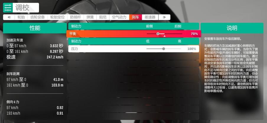 刹车相关的调校选项主要影响的是刹车手感,并不会影响刹车效率的上限。