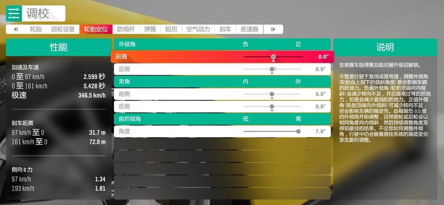 前后倾角 - 数值越小,越容易转向不足,反之亦然;一般设置为最大值7.0