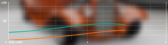 5000转开始,功率增速放缓;6000转时,达到最大功率;7000转时断油,达到最大转速,此时功率为376kw;5200转时,功率与其一致