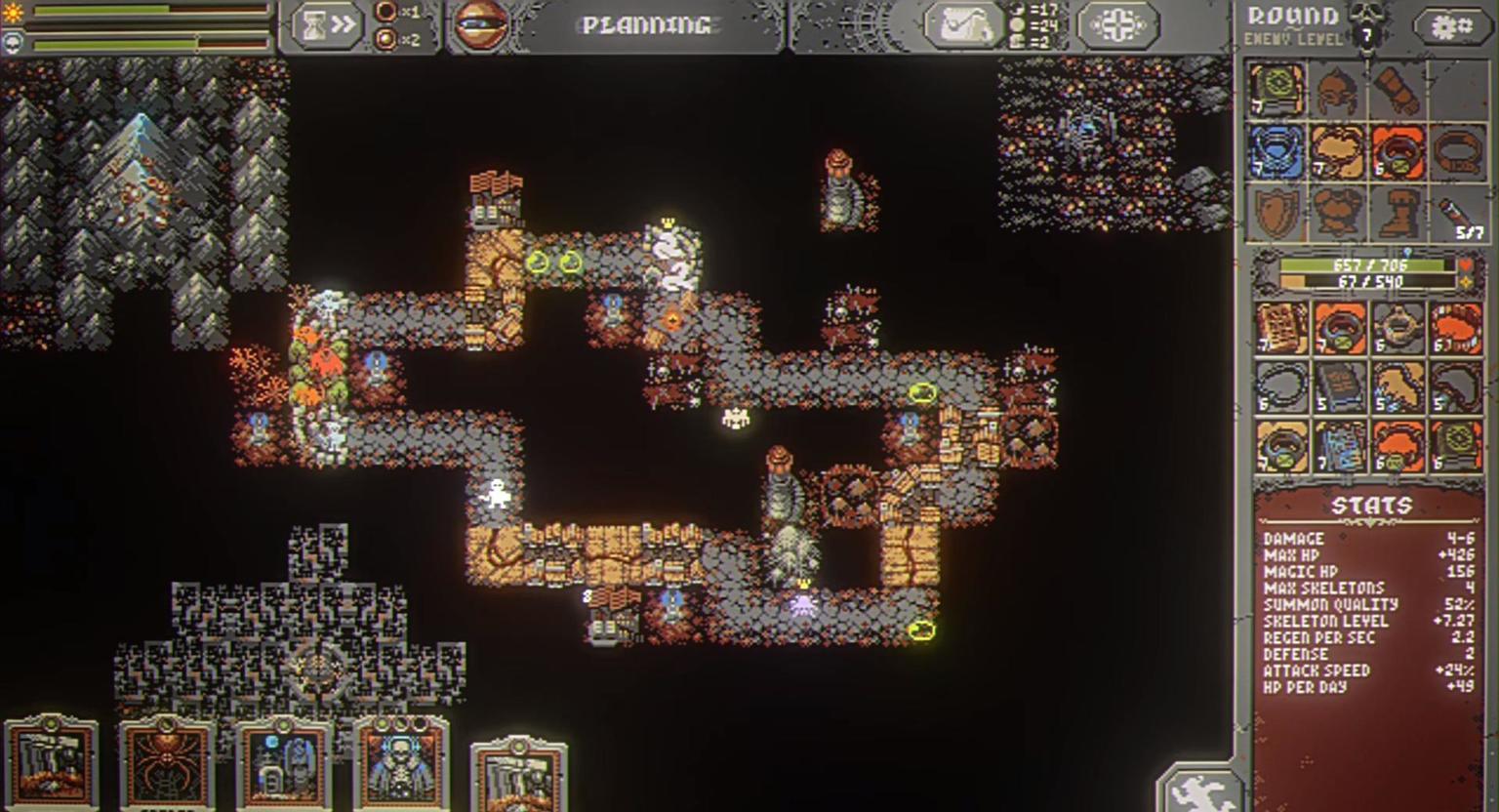 游戏的地图也是非常简洁的,玩家会在一条闭环的道路周而复始的前进,这条道路就像是前往恶魔城前的浓雾森林,充满着危险与陷阱。玩家会在路上碰到各种随机敌人,当然这些敌人都取决于我们所放置在路周边的建筑,比如全是蜘蛛的盘丝洞,吸血鬼的豪宅,哥布林温暖的小窝……而路远处的风景你可以根据自己想法去放置森林或者山脉来增加自己的buff。