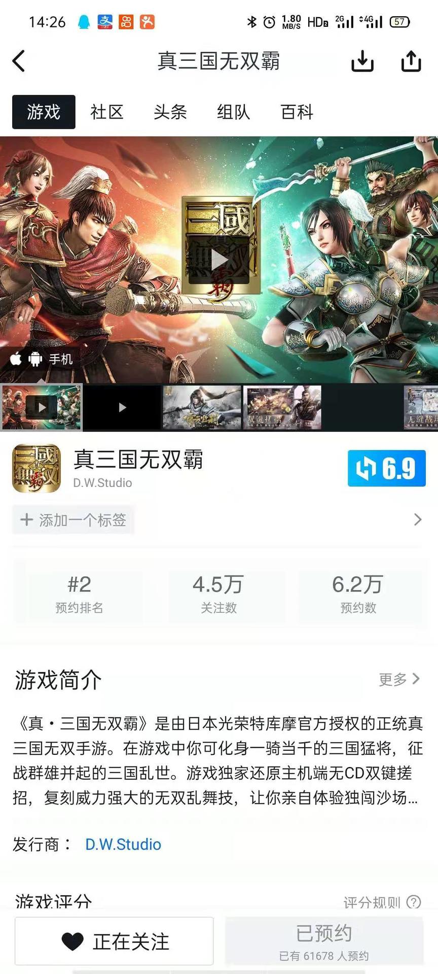 Step1:点击下方游戏卡片预约《真·三国无双 霸》手游