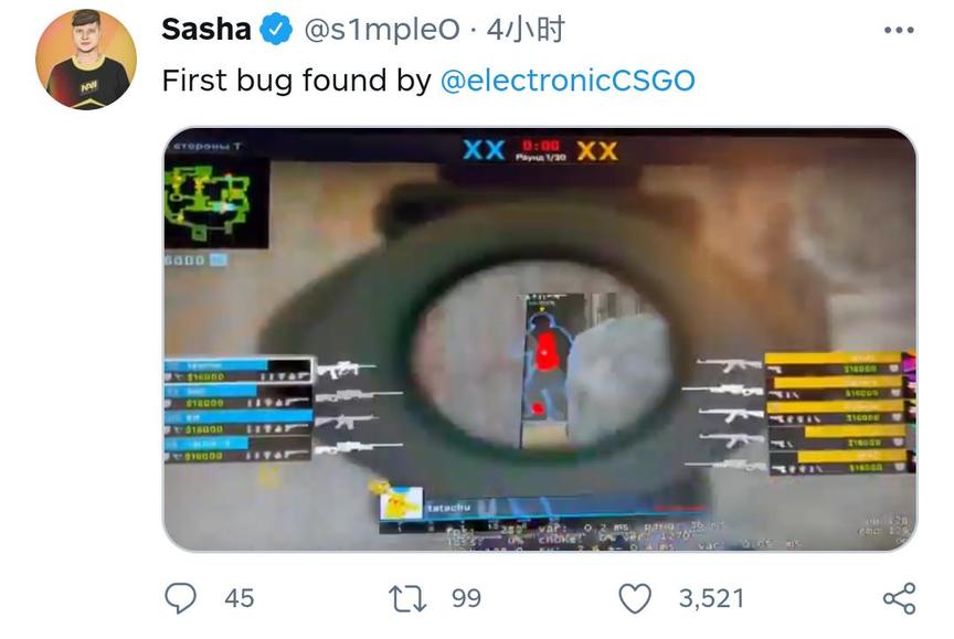 s1mple:啊哈哈,家人们这是啥图哟?(12小时后的第二条)电子哥已经找到第一个BUG了。