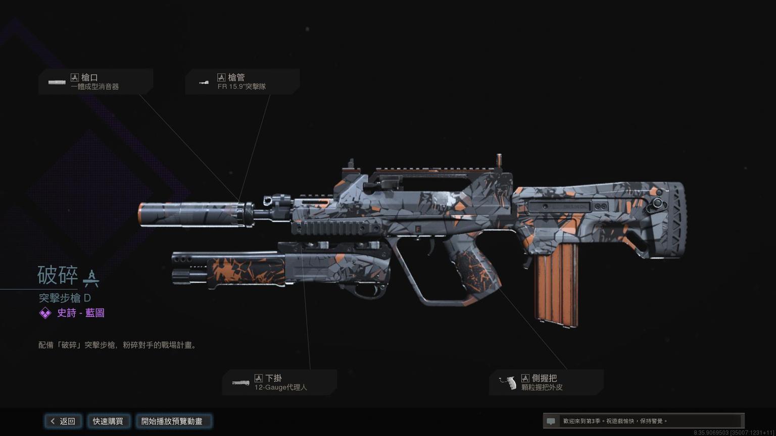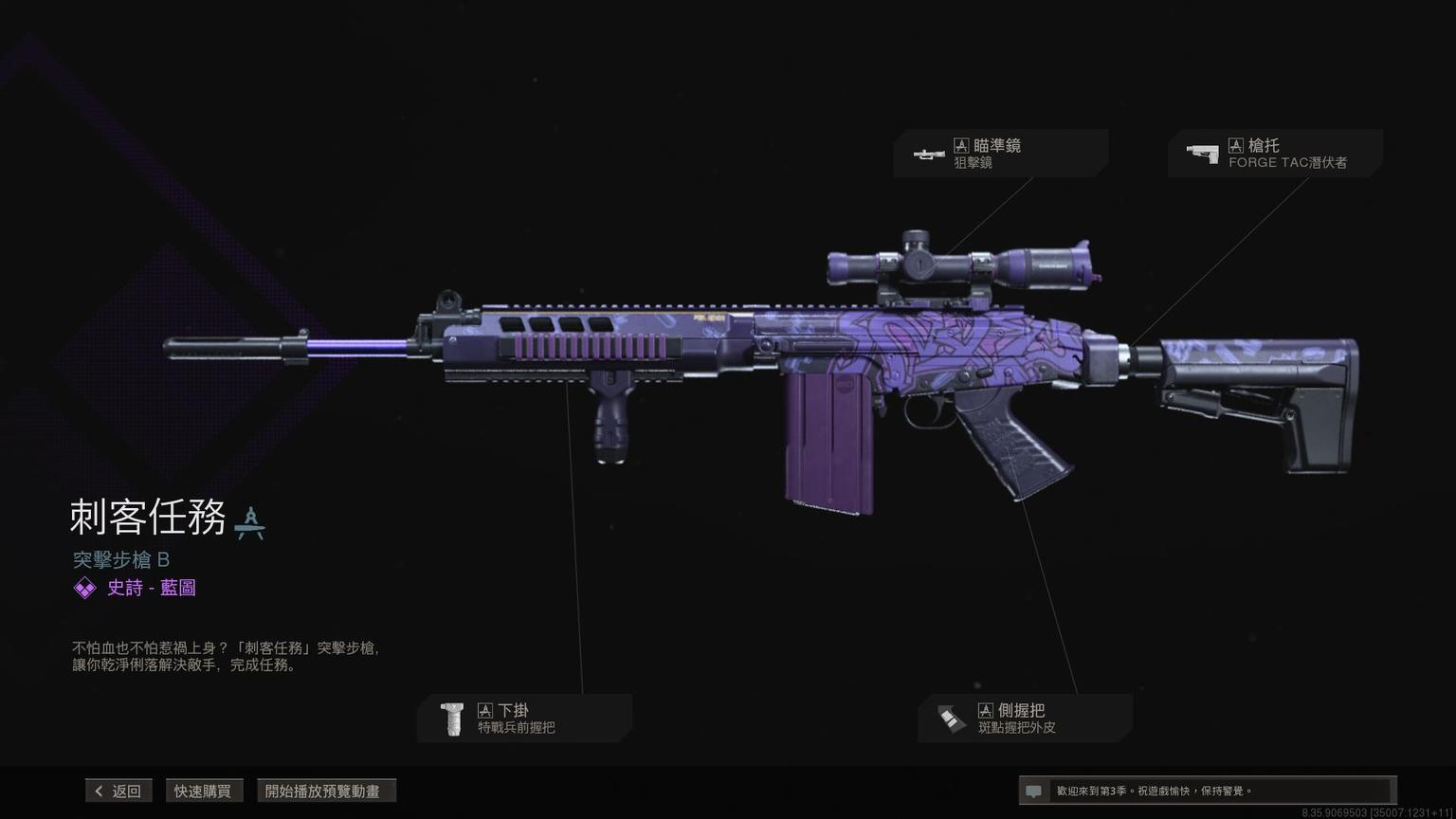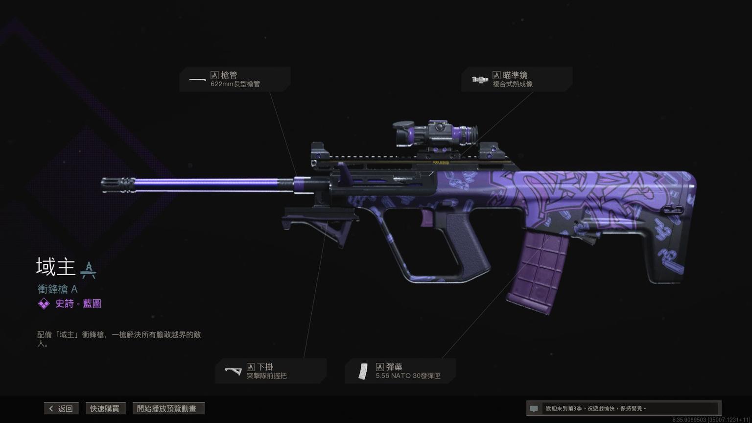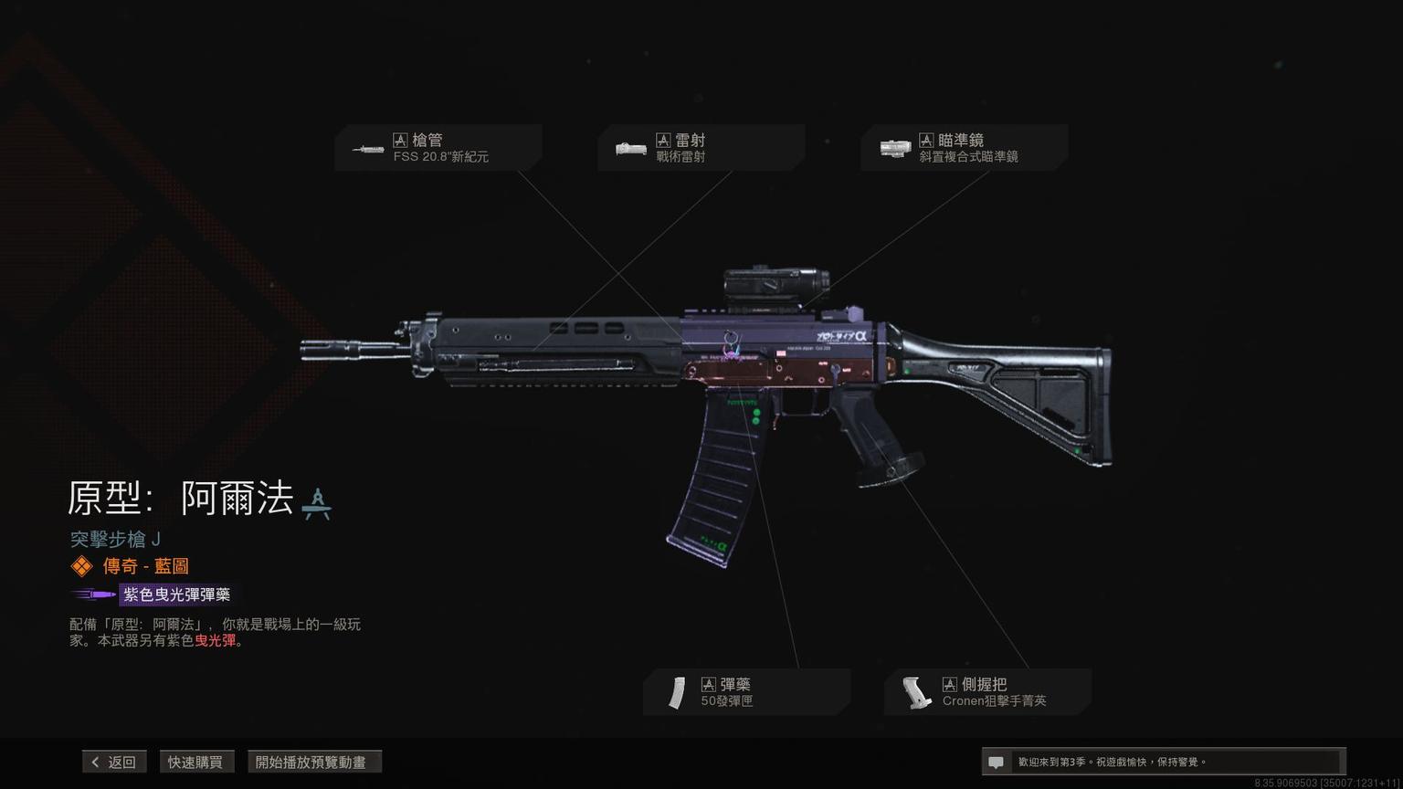 突击步枪Grau 5.56传奇蓝图<原型:阿尔法>,带紫色曳光弹特效。