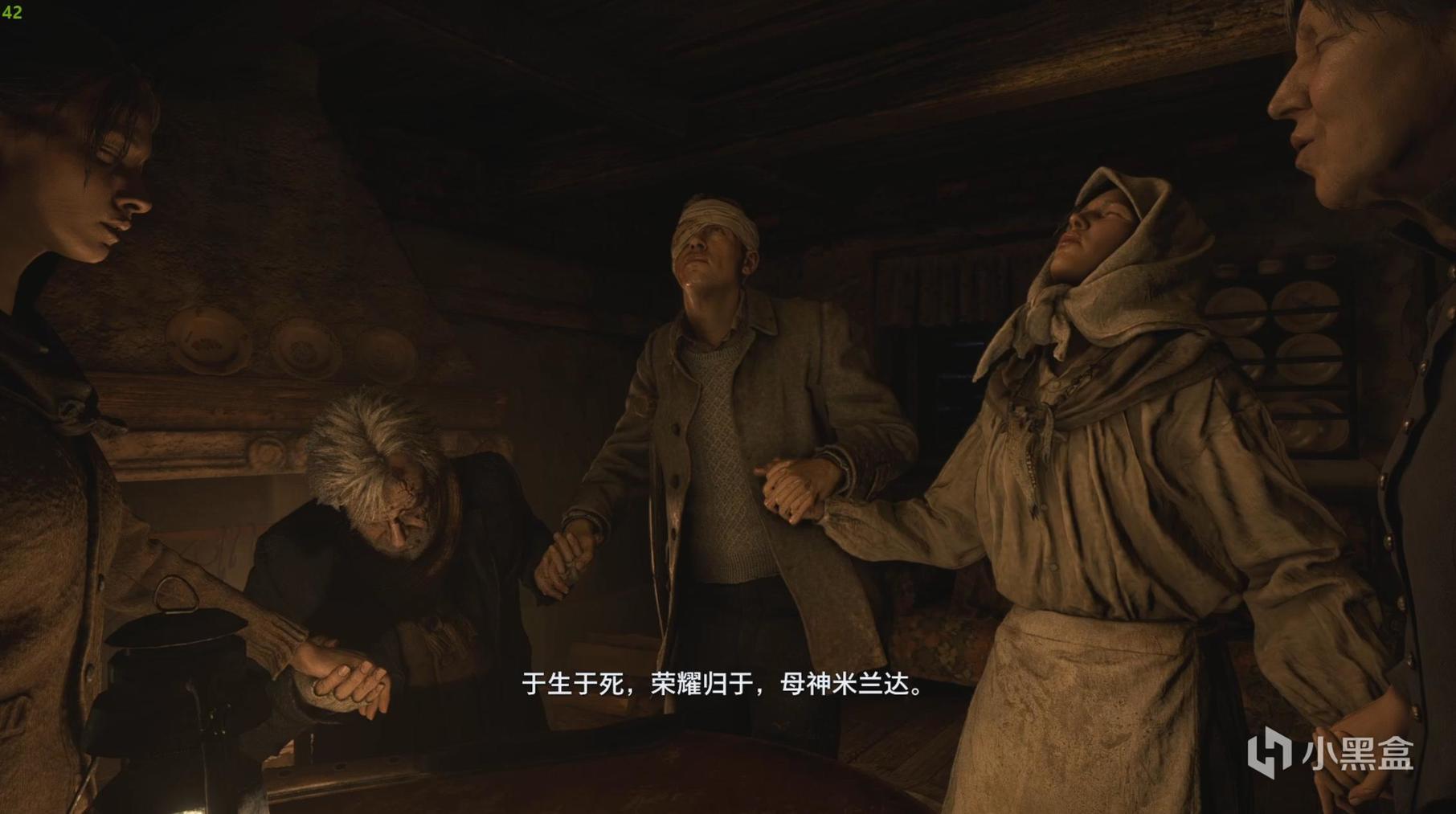 不过在开篇主角伊森并未体会到这个“邪教”仪式的恐怖,他以一种别开生面的方式见证了村民们宗教信仰的“破灭”:在和幸存者们见面时,一位受伤的村民在大家齐声高颂主母“米兰达”的名号之时突然发疯,杀死了在场几乎所有的村民。我在游玩这段场景时的体会是,在祈祷救赎时反受残害不仅是对盲目崇拜的讽刺,也是突出邪教的邪恶之所在。