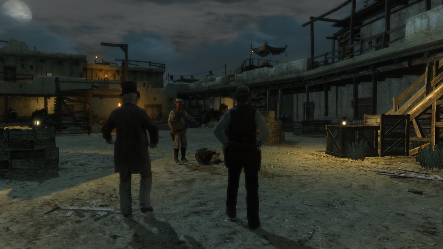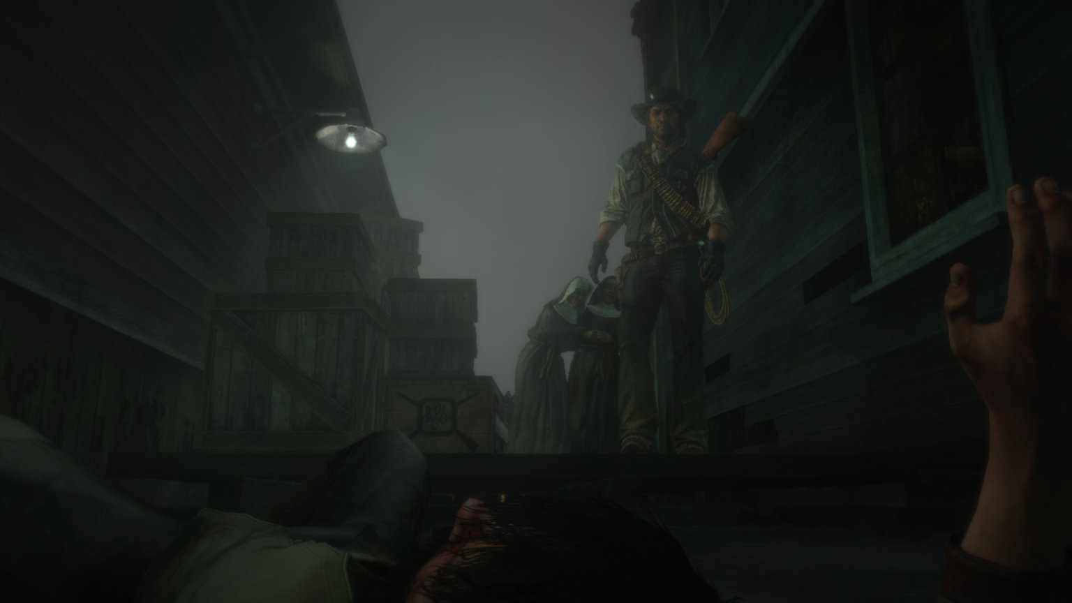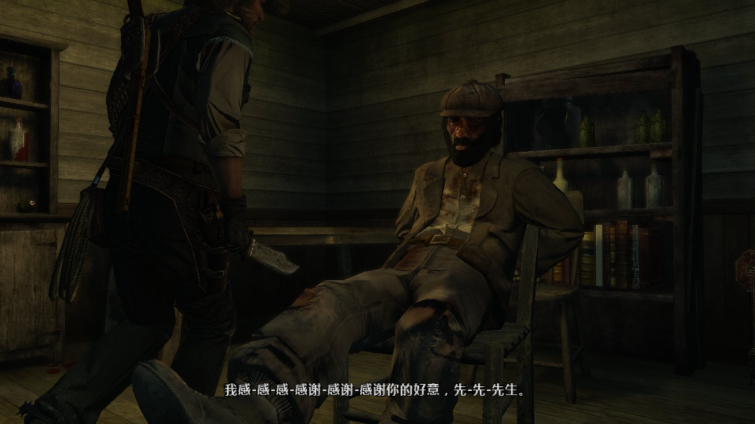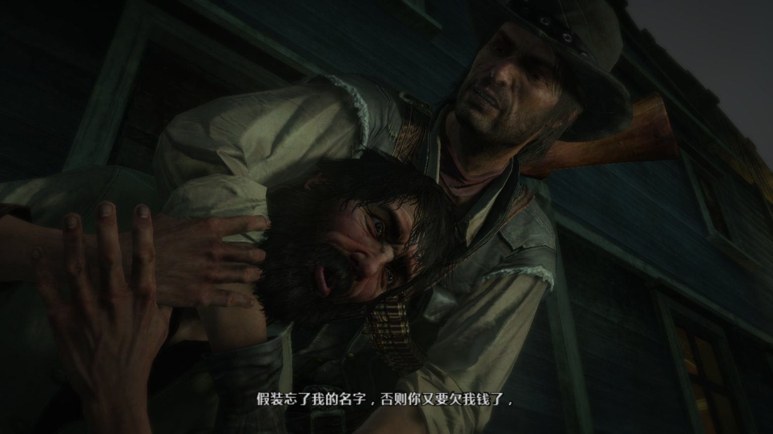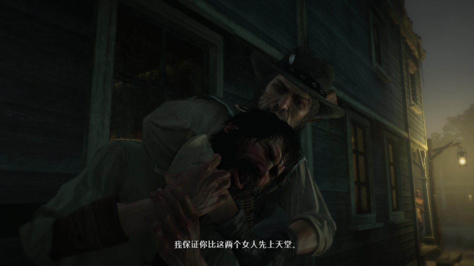 约翰只能跪下,然后突然拔枪杀人。他两枪两个,直接把这群流氓打散了。他并不想弄脏帽子,于是射击了最后一个人的腹部。而不是爆头