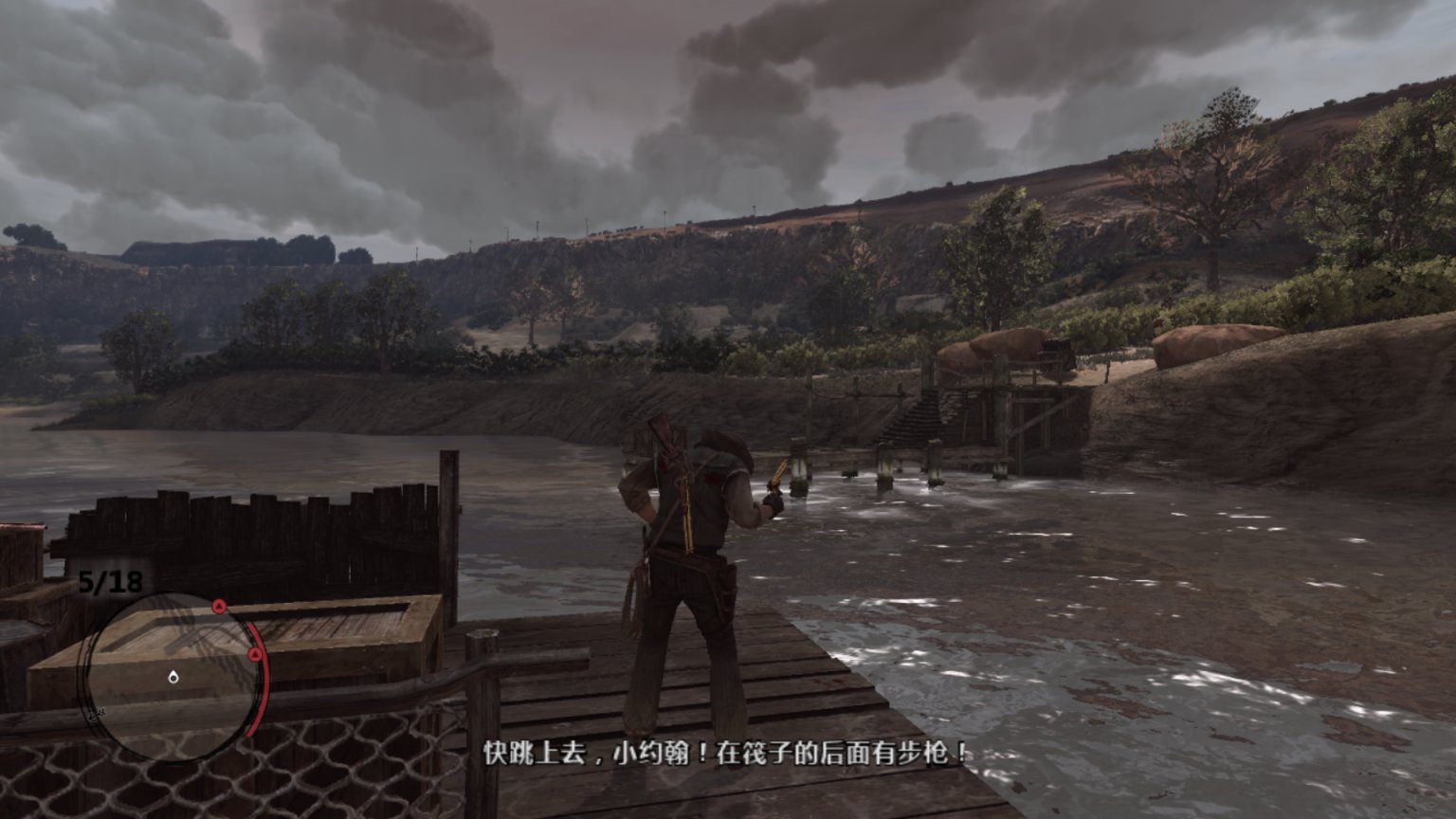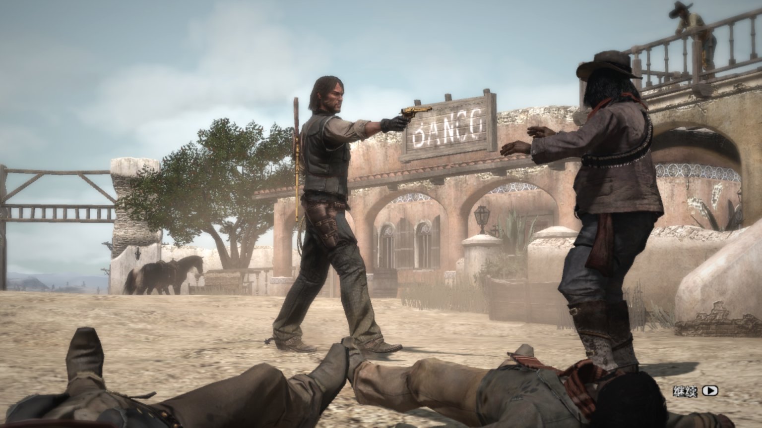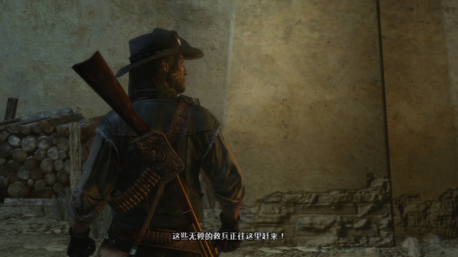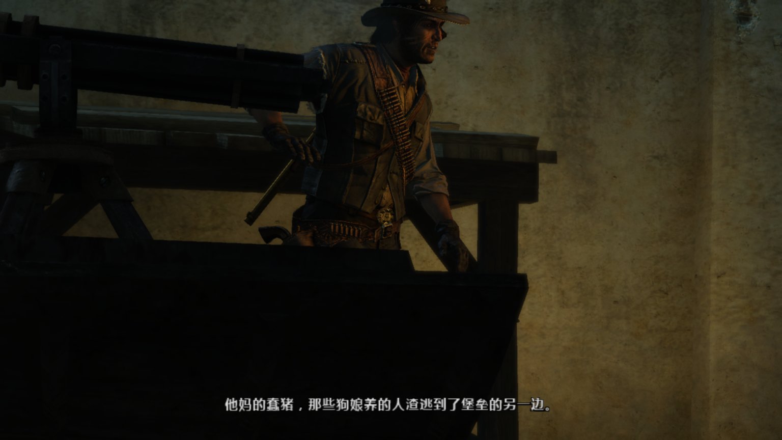 约翰马斯顿爬上机枪,看着外面的追兵。