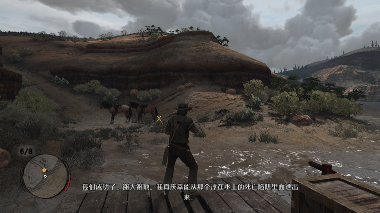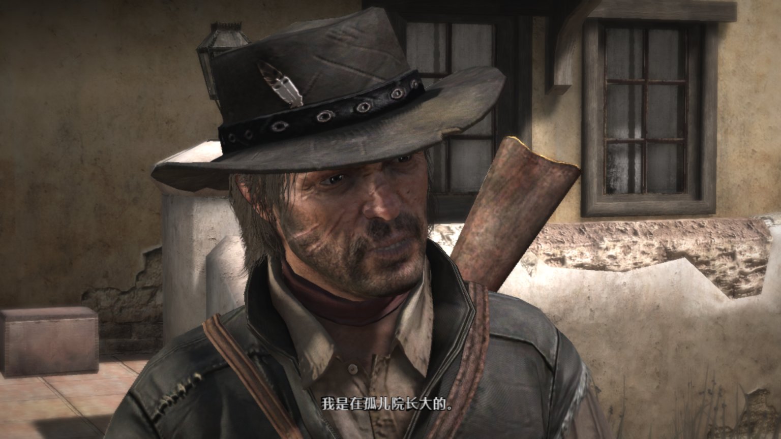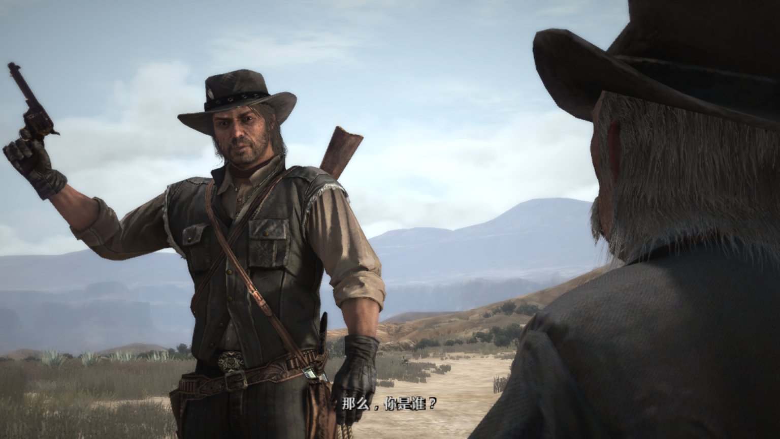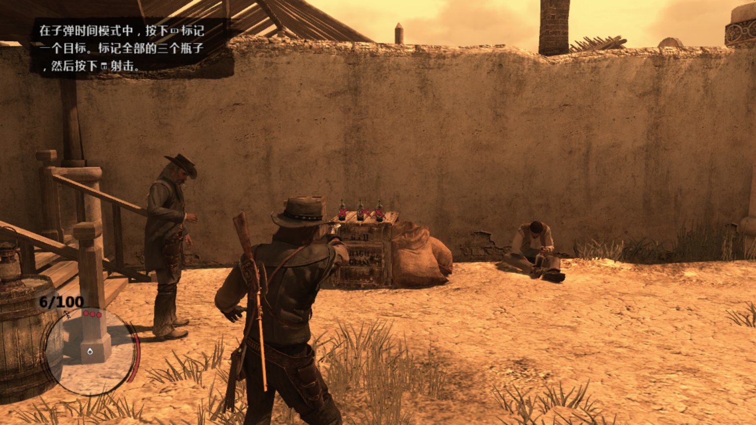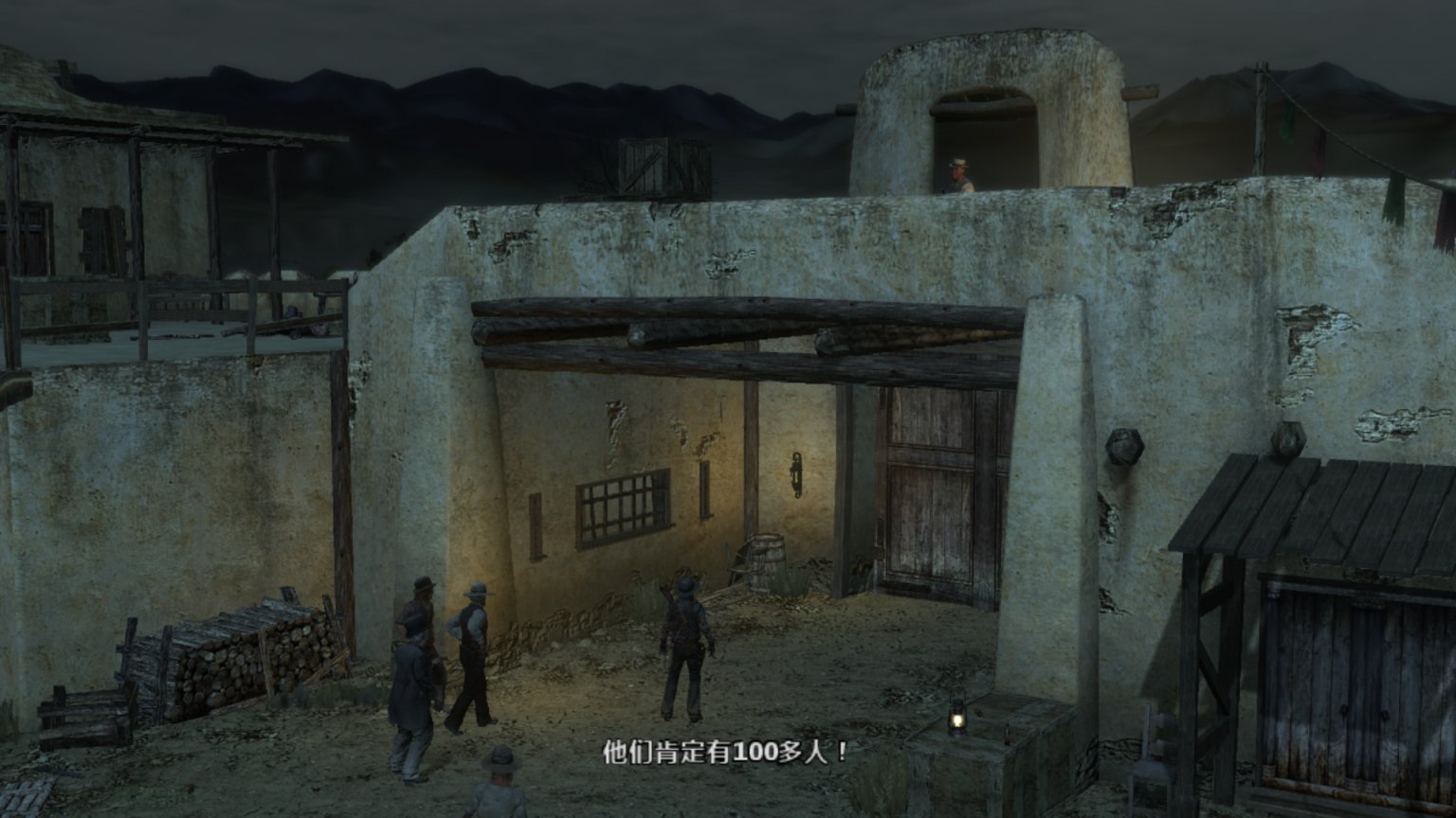 约翰马斯顿爬上机枪,看着外面的追兵。