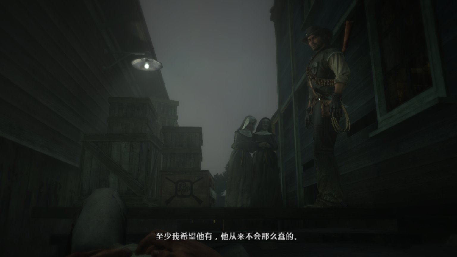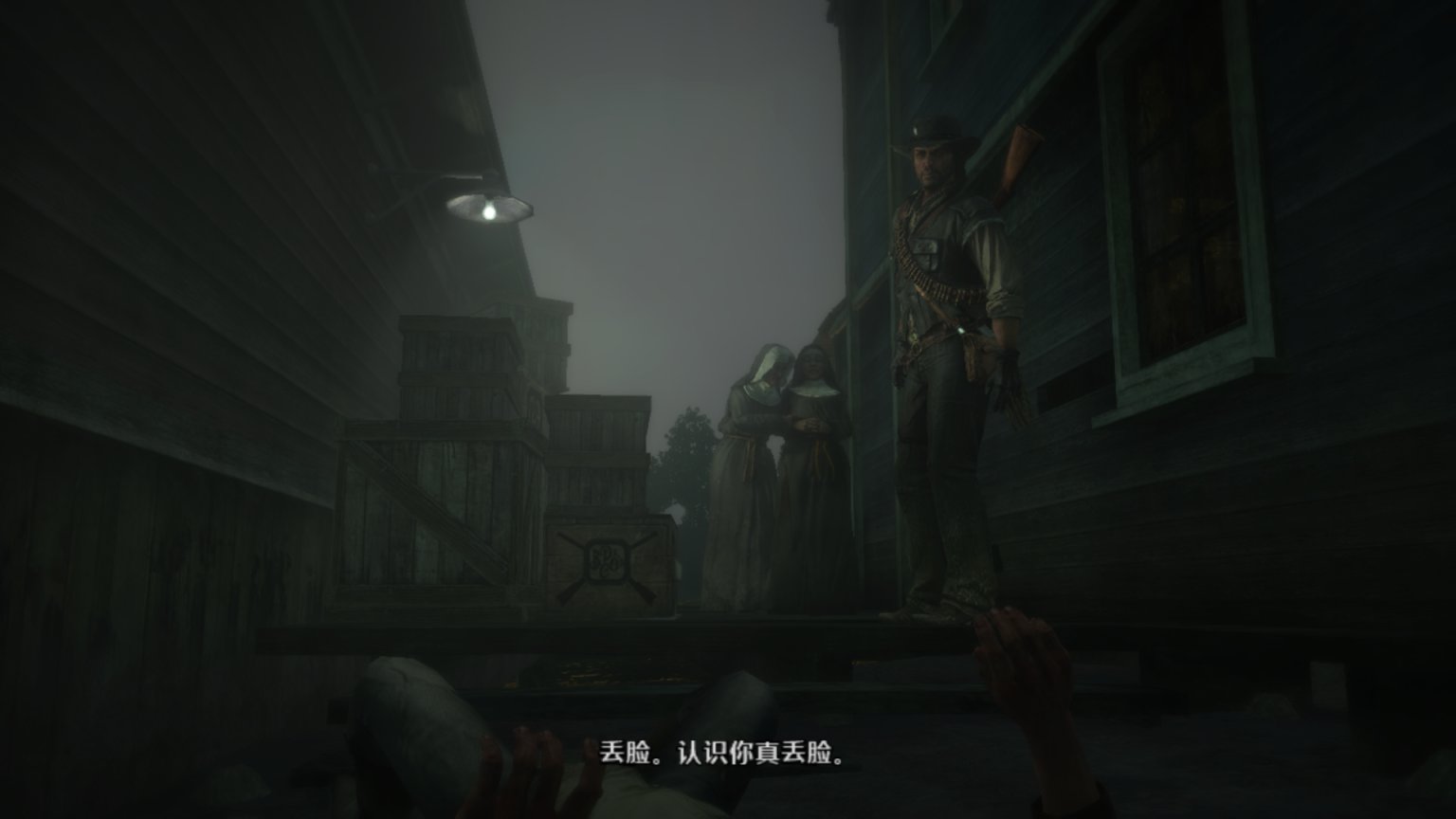 约翰听见酒馆旁边有叫声便走了过去,这个该死的酒鬼又在骚扰女性。他拿着手枪拦住了两个修女,要求她们把衣服撩起来让她看看。