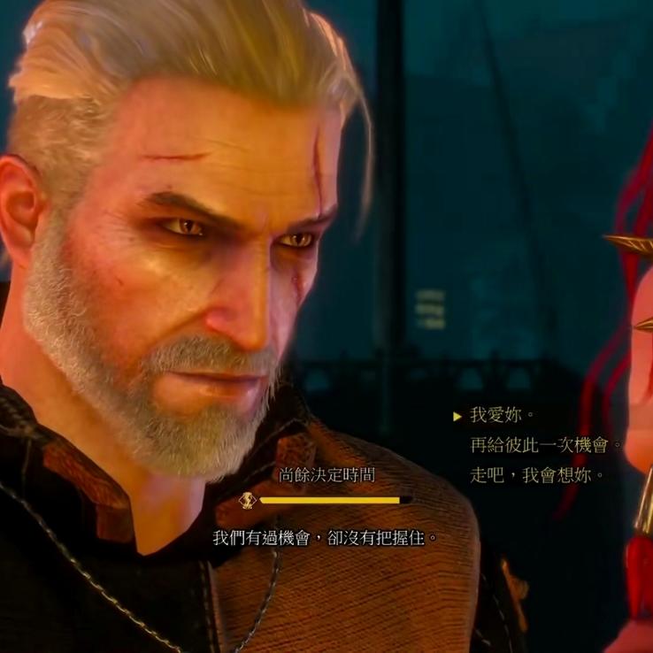 叶奈法先说了自己的感情没有变,然后等着杰洛特回答。这时候两个不限时选项出现了,明明白白:示爱或当场分手。
