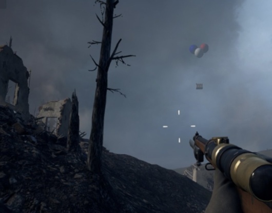 触发方式:在地图凡尔登高地中,先打碎三个酒瓶,后枪击三个房屋上的风向标,就会看到红、白、蓝三色的大气球带着一个小房子慢慢飞过战场,逐渐消失在烟雾中。