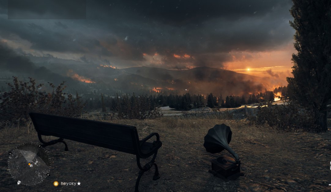 在卡波雷托地图中间破败神庙的右方,有一长椅、一酒瓶、一留声机,捡起酒瓶敲打一下留声机,留声机就会开始播放音乐。眼前是燃烧的森林、爆炸的炮弹、子弹的呼啸以及残缺的庙宇,此时配合幽幽的音乐,将战争的荒凉与凄惨渲染得如人亲临。不过这只是个开始,接下来你将感受到制作组的“爱意”。