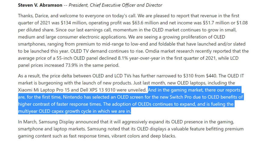 其次Universal Display公司早前发布的,财报新闻稿中并未提及任天堂或Switch半个字眼。