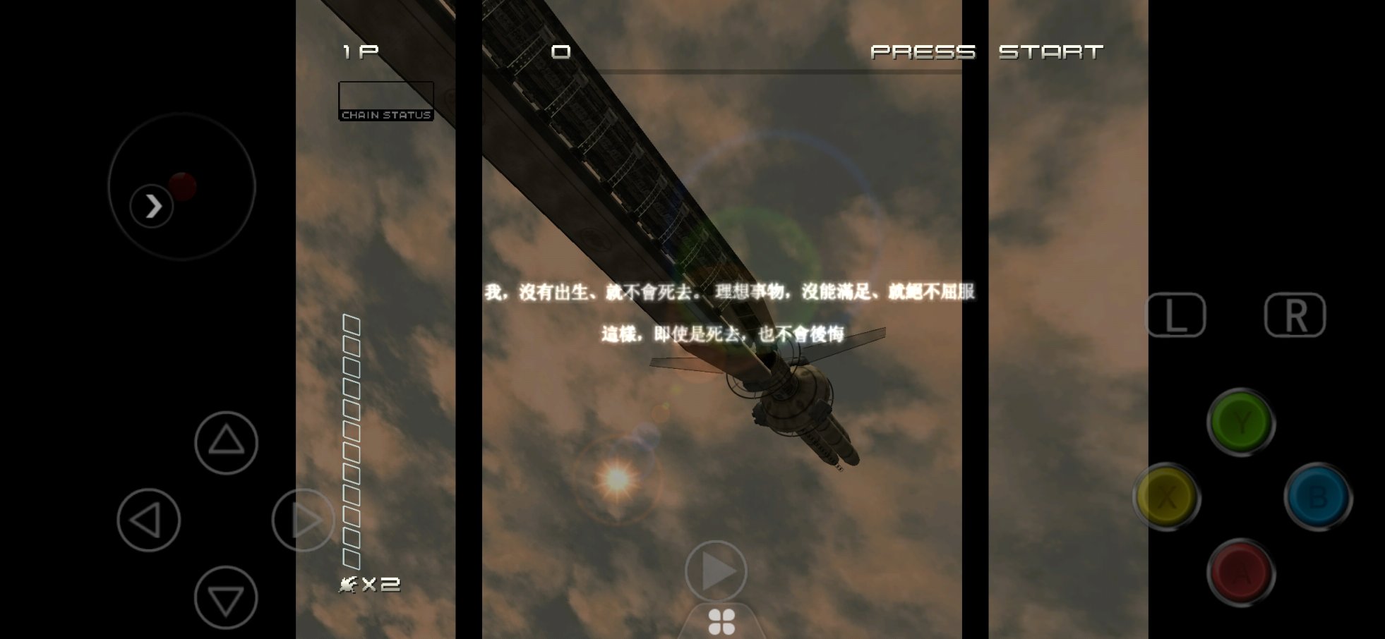 以下剧情就开始了玩家操控部分,玩家将扮演的主角是冒着必死的决心去击垮凤来之国,玩家闯过“理想、试炼、信念、现实、轮回”这五关后,面对最终BOSS,男主选择了与敌人同归于尽,以自我的自由为代价,还世界以自由…