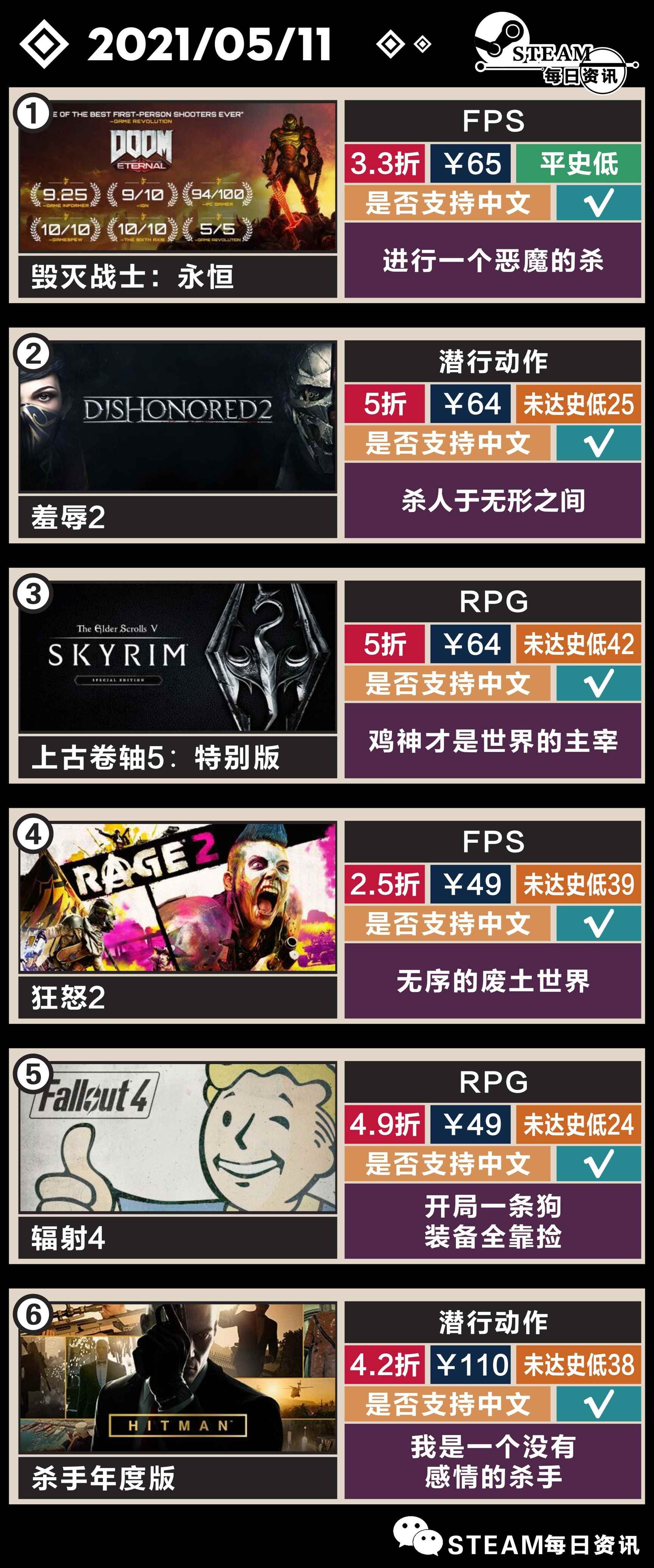 进行一个恶魔的杀 - 毁灭战士:永恒,FPS,支持简体中文,3.3折,售价65,平史低(首次史低时间20.11.25;最近史低时间21.2.11,近期折扣力度不一),性价比良好,促销截止5.17。