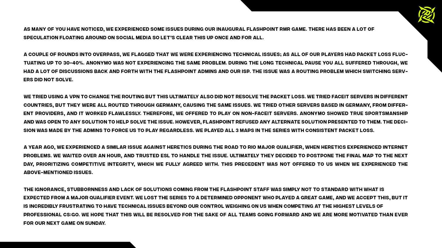 在NiP的一则官方生命里,出现了以下字眼,“我们有30%-40%的loss,而Anonoymo却没有遇到任何问题,跟技术方的长时间讨论也无法解决什么。后来我们被迫用VPN,延迟好转但依旧有丢包。其实我们本来向Flashpoint提供了TopLayounNon-Faceits服务器——一款全匿名,真正体现体育精神的服务器;但Flashpoint拒绝了所有替代解决方案,只能说他们的员工无知、傲慢又没啥能力,完全不符合标准。”