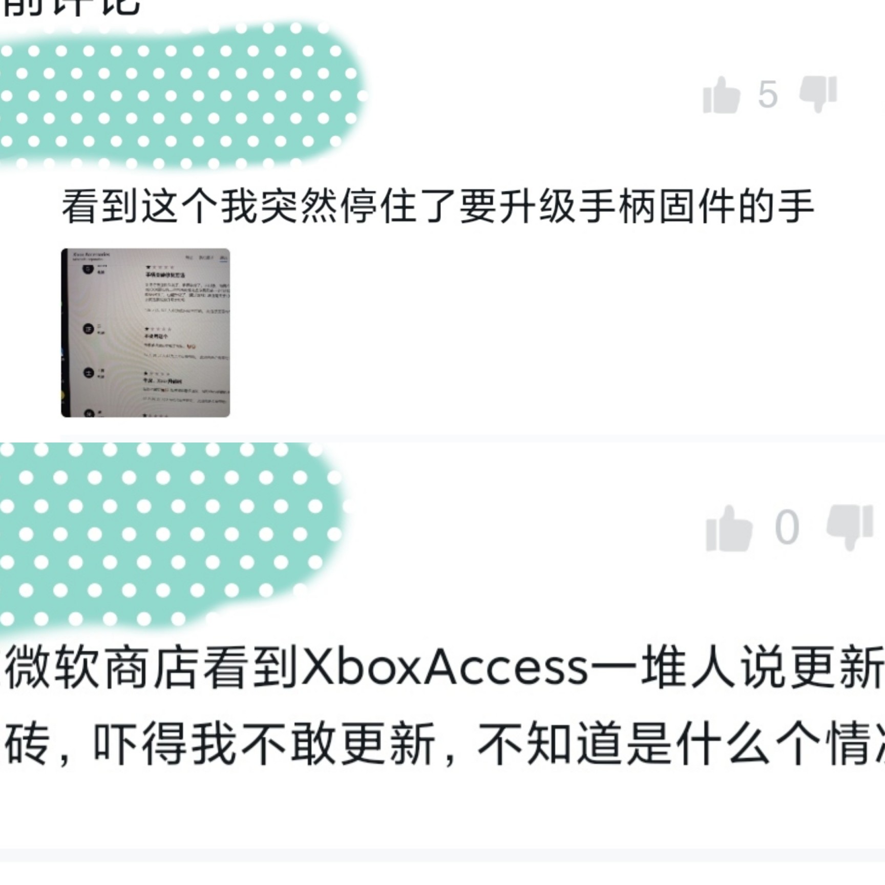 ②其次就是升级固件这方面了。很多人都说看到微软商店的Xbox Accessible里的差评,都说会变砖,因此都不敢升级固件了。在这里我要讲的是,xsx手柄买回来一定要更新固件,否则蓝牙的时候就会经常断联,并且xsx手柄目前来说是安全的,我还尚未发现有xsx手柄升级变砖的案例。至于ones的老哥们,要说的就是升级固件手柄变砖目前来看基本上都是以前的案例,就目前情况来讲,如果还是害怕的话,大不了就当不知道能够升级固件这回事,就继续接着用,咱不升级了,好吗,宝。