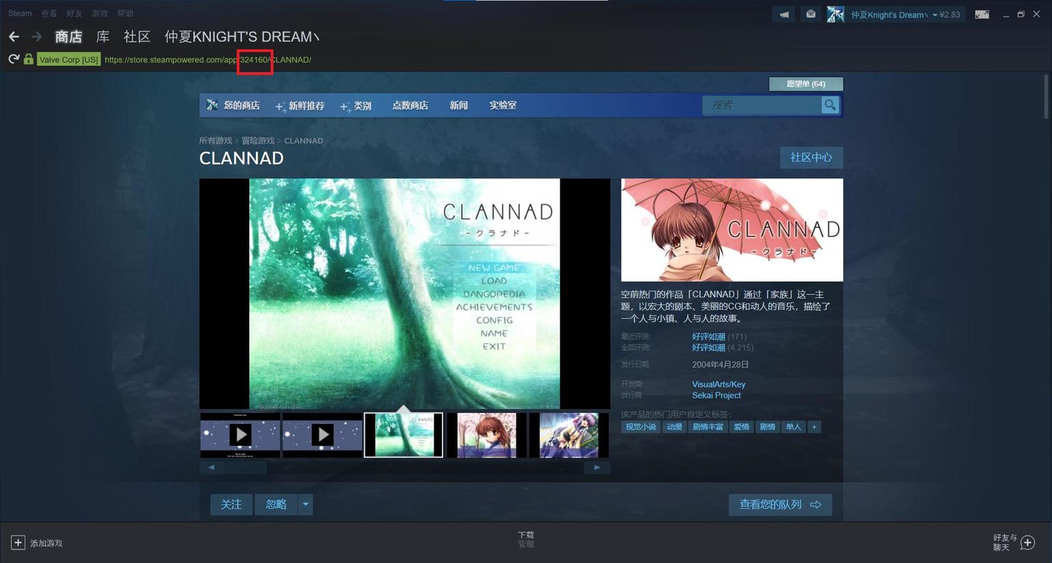 这一个个数字对应的正是Steam游戏的ID。比如最上方的“324160”对应的是商店中的CLANNAD。你可以在游戏的商店页面中轻松找到每个游戏所对应的ID。