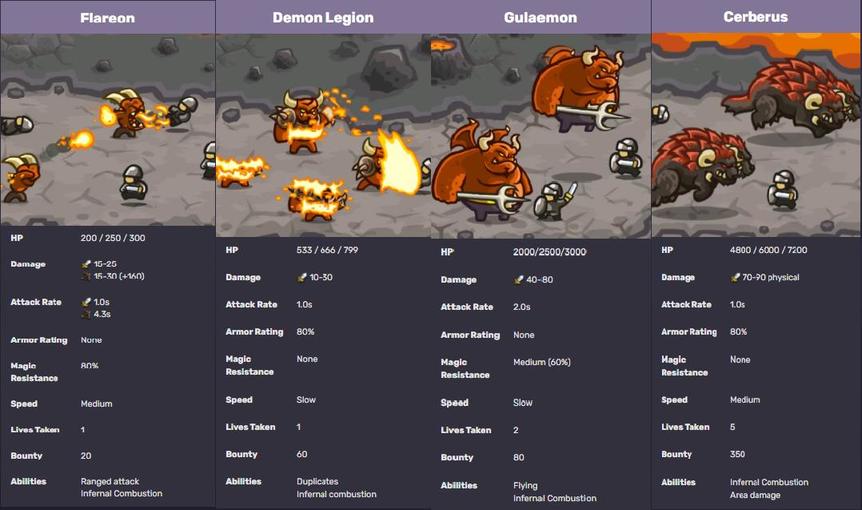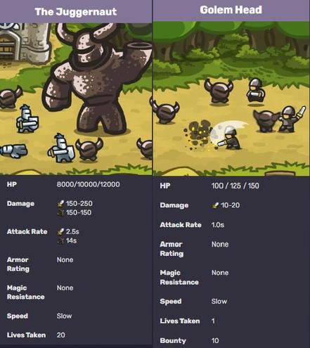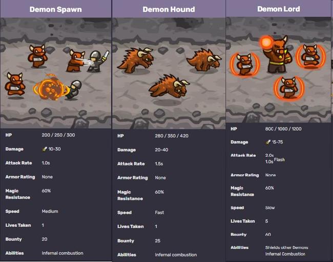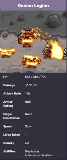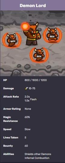 这个敌人主要恶心的地方是要结合整个地图关卡来看,首先就其出现的两个熔岩地图里,恶魔除了他就全是高魔抗,而其80%的高护甲又不得不促使着玩家耗费资金建造魔法塔进行解决,其本身的攻击伤害类型似乎是真实伤害,但10-30也算能接受,其复制个数有上限但是该敌人在后期往往又不是单个出现。