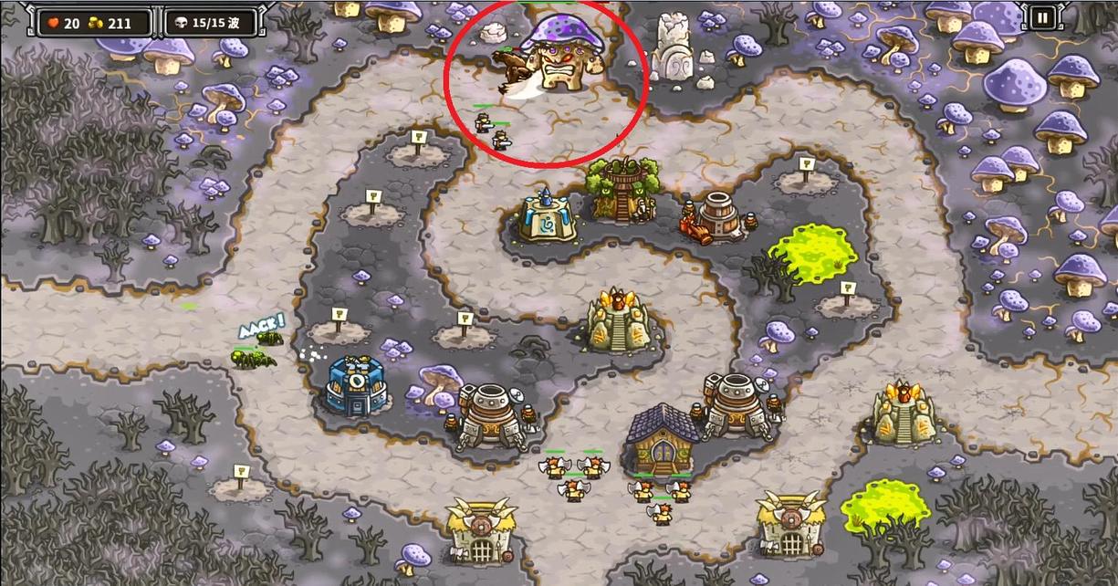 以及,其开始进行毒雾并释放的攻击是在其走到地图分岔路口处开始,当玩家在其分岔口前派英雄援兵进行阻拦时,它不会发动毒雾,结合着箭塔足以进行攻击的距离,可以在其发动毒雾攻击前就耗费他一大半管血。