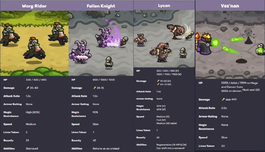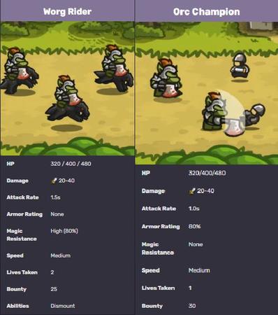 这实际上我认为也是游戏设计中对于玩家的一种引导,引导着玩家对应建立起相应的物理伤害和魔法伤害两种类型都进行兼顾的防御塔。以及这里专门将两个拿出来讲就是在于他们分别在第一次击杀和第二次击杀时都会给予相应的赏金,如兽人骑士在骑乘状态下被击杀即是其骑乘的座狼被击杀,给予25赏金。