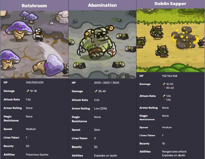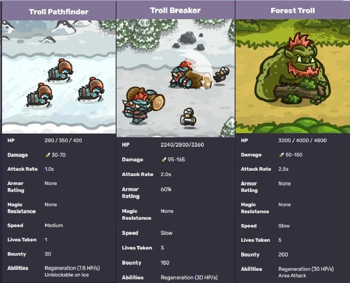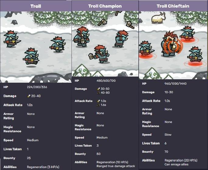 这类属性机制的设置就在于当在遭受防御塔的攻击时,他们相比起其他无再生属性的敌人能抗更久一点,这一点来说,之前我对于一代地图关卡分析中也有提过,在雪山场景关卡那一堆矿洞的设计便有使得巨魔类敌人能在矿洞里能安安稳稳回血。