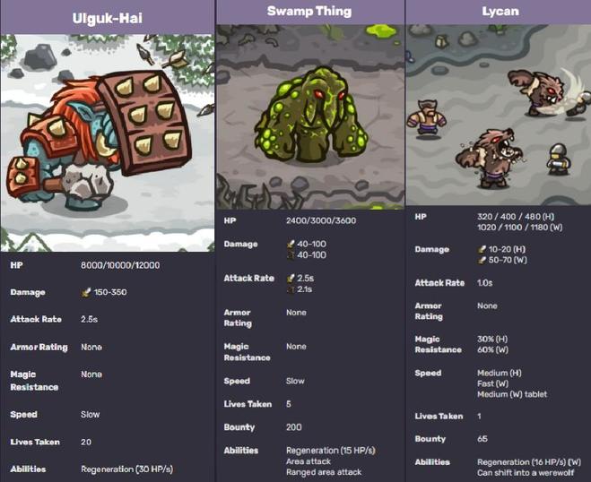 而沼泽巨人和强狼人主要是恶心在他们本身还有远程范围攻击和攻击能转化狼人的特性,一个是可能杵在防御塔火力圈外扔一会屎球就回一大管血,一个就是你眼睁睁地看着他剩下一丝血皮但就是不死甚至还能把你兵营士兵三个都变成狼人偷你家。
