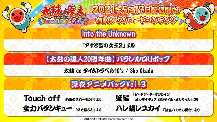 说到万代,《太鼓达人》今日推出了最新的多个付费曲包,其中包含冰雪奇缘2、约定的梦幻岛、凉宫春日等动画曲目。
