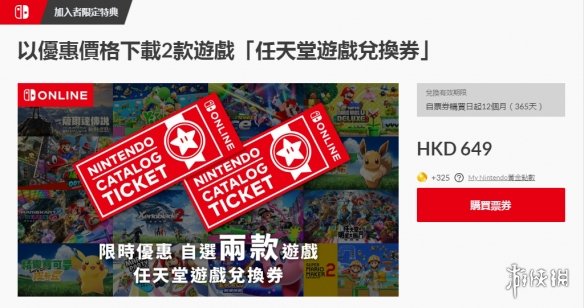 “任天堂游戏兑换券”是任天堂Switch会员“Nintendo Switch Online”的限定商品,购买后一年内可以649港币的优惠价格购入2款Nintendo发行的指定下载版游戏软体(※1 可以兑换任天堂游戏兑换券之有效期限内发售的游戏软体 ※2 HKD 324以下的游戏软体除外)。