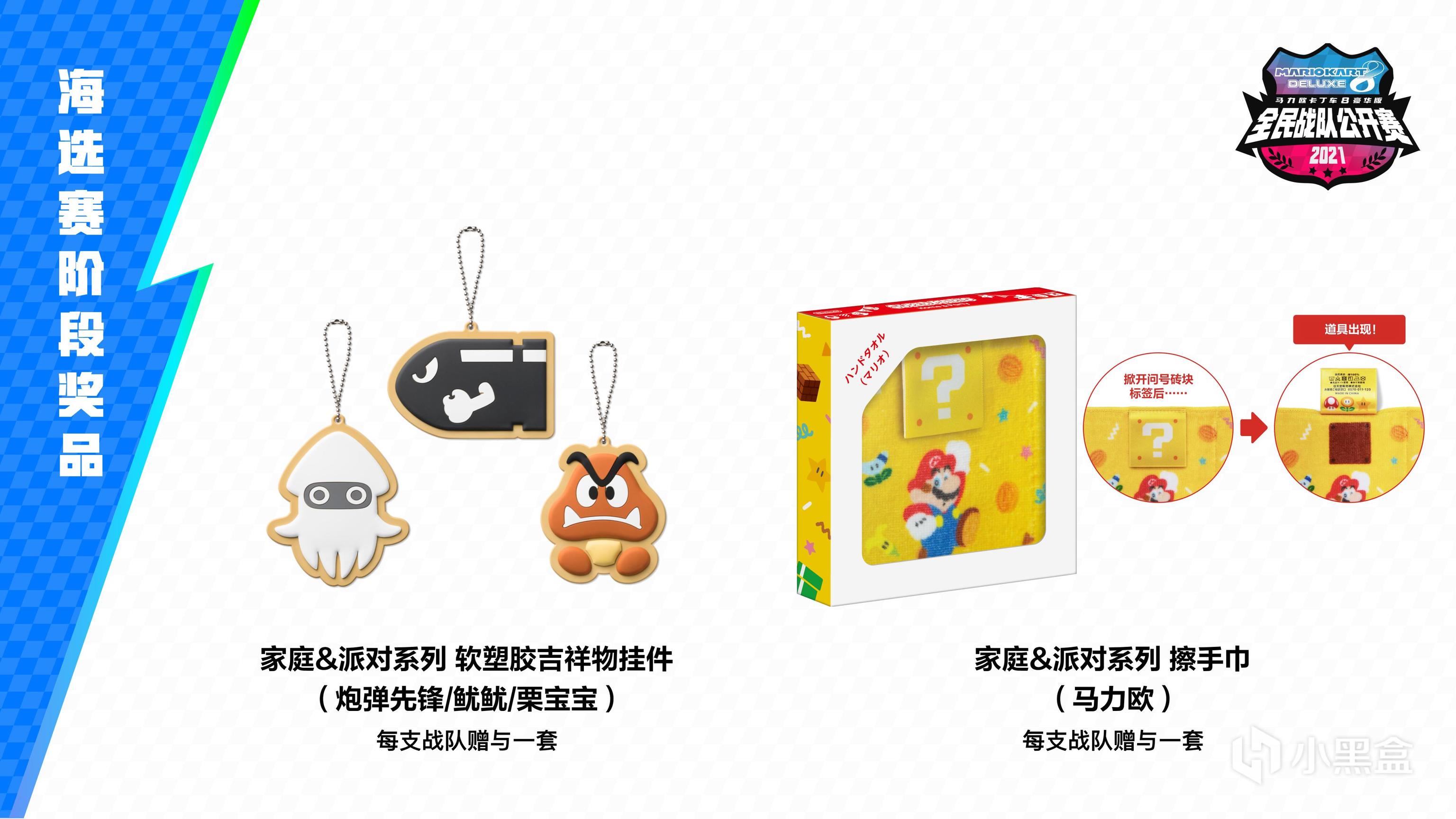 2.任天堂官方周边商品,将会作为本次赛事的参与奖发放。凡是完成海选赛赛段比赛的战队都可获得在日本发售的任天堂官方周边作为参与奖(家庭&派对系列 软塑胶吉祥物挂件和擦手巾各一套,奖品样式详见下图),之后战队达到不同的赛事成绩即可获得更多丰富的任天堂官方周边商品奖励,成绩最优的队伍将获得包含20件奖品的冠军套装!