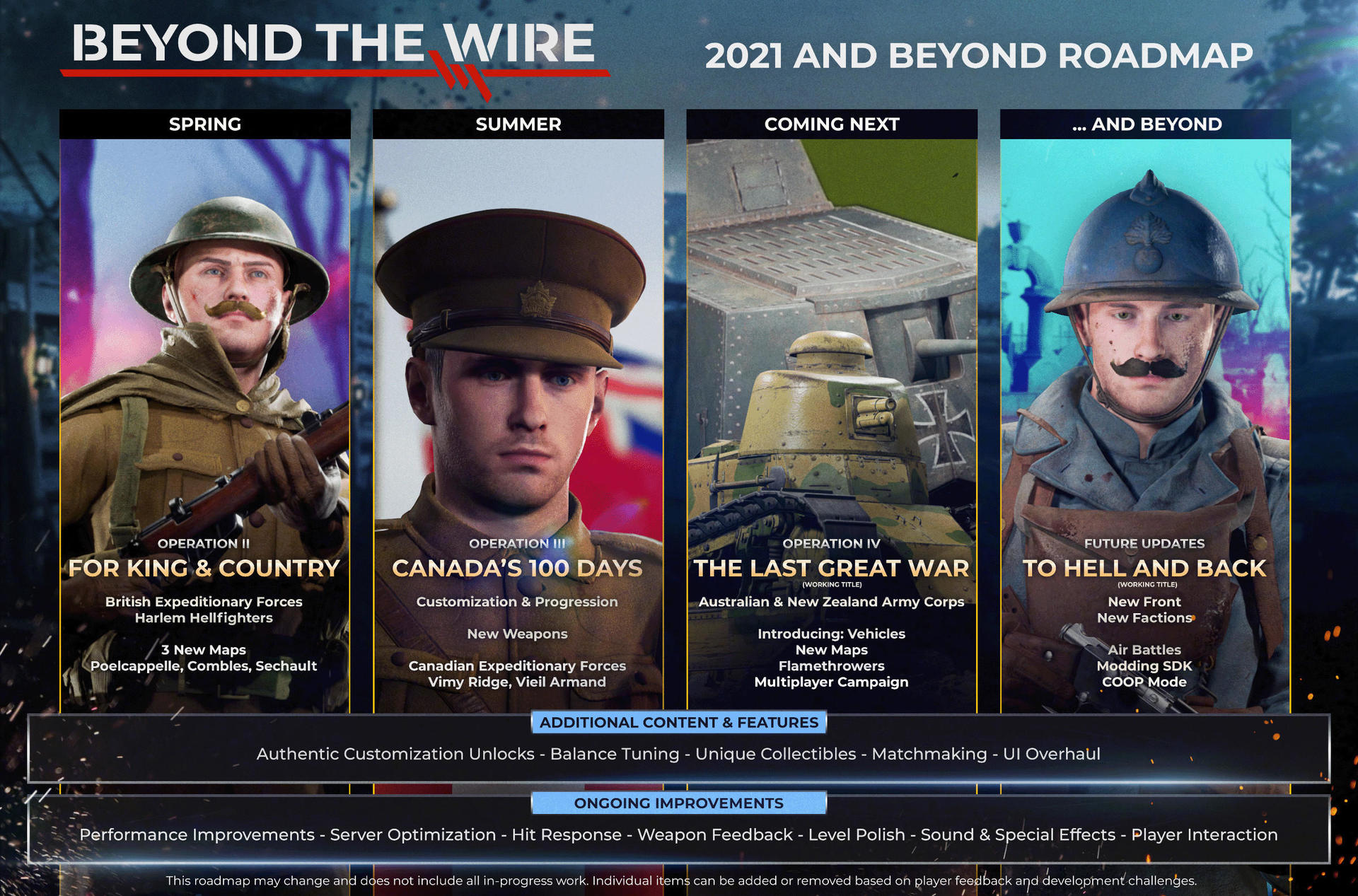 从这张线路图中可以看出:BTW在今年春季已经更新了第二章,并带来英国远征军阵营。本作在今年夏天还将更新加拿大远征军阵营,新地图(包括著名的“维米山脊”)和武器,可能的等级系统,以及基于真实性的可解锁装饰品。在未来的更新中,开发组还将带来澳新军团阵营,坦克,火焰喷射器,以及多人战役模式。以及随之而来的优化调整,服务器优化,音效调整,和玩家互动。