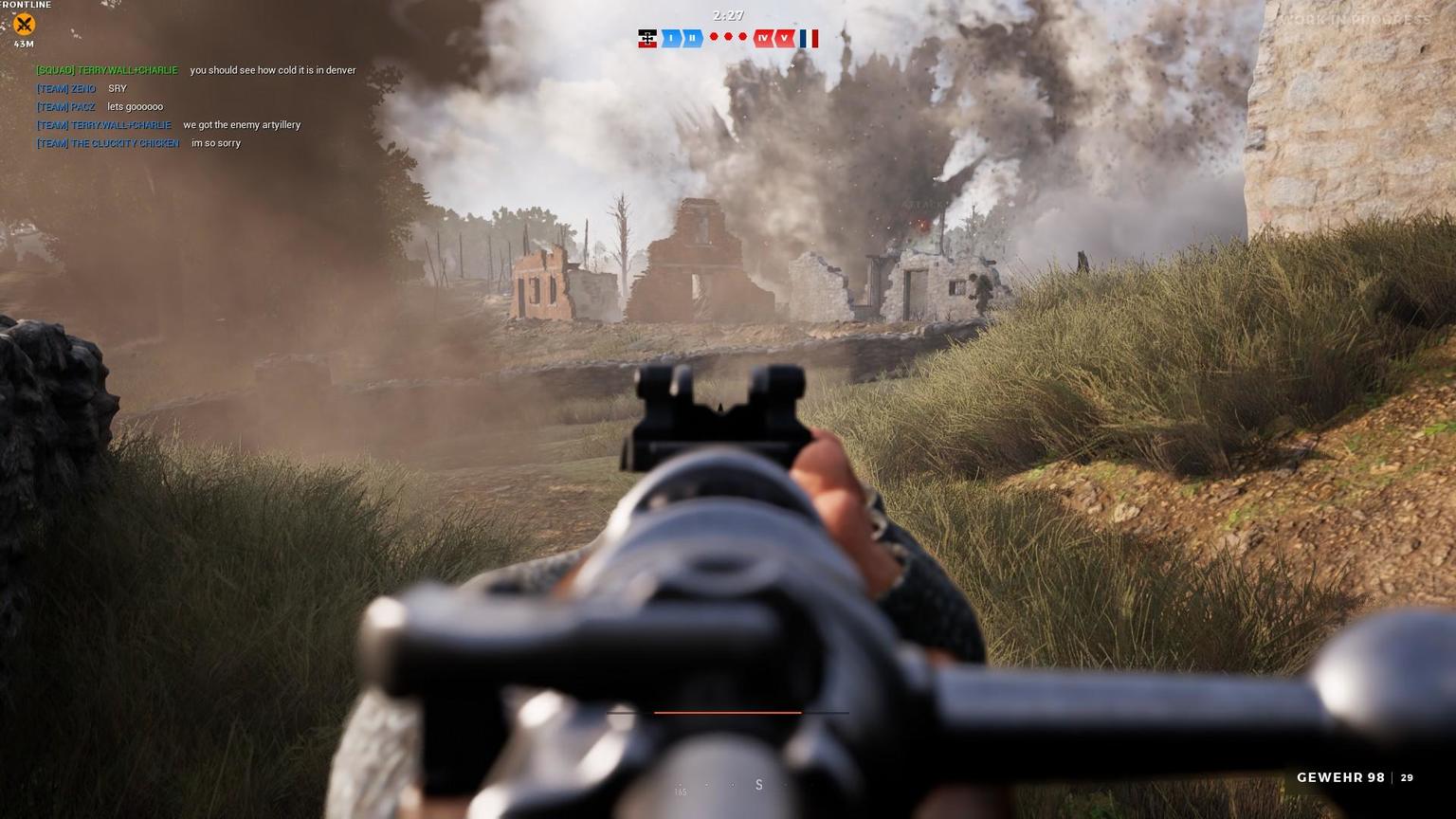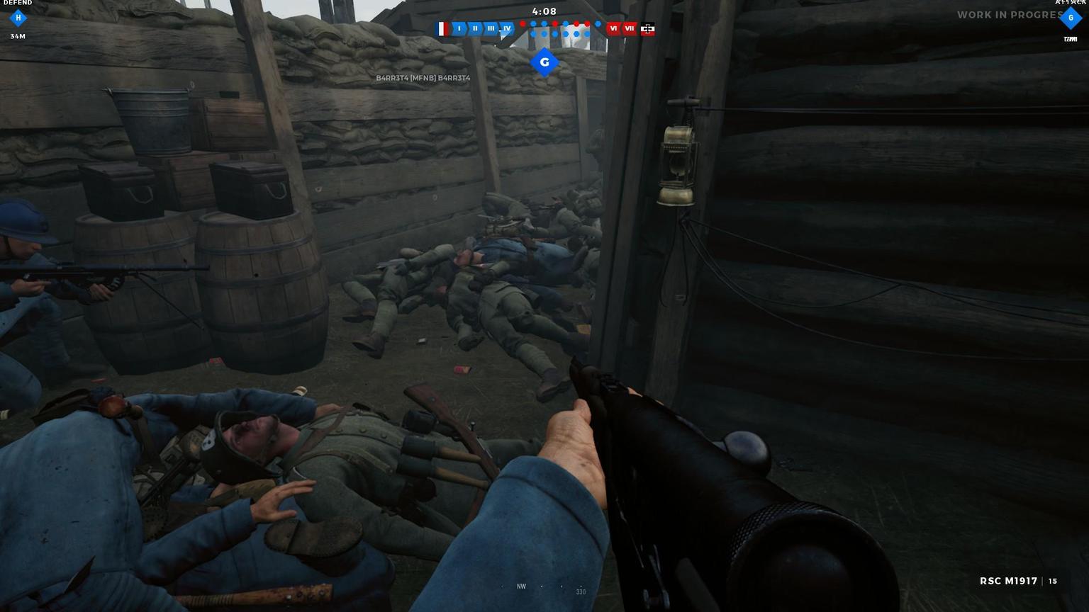 笔者在之前提到了BTW的“精通难”。玩家在尝试除步枪兵之外的兵种时,学习成本会相对高一些。本作中的突击兵装备半自动手枪(德军)/自动装填步枪或左轮枪(法军)/霰弹枪或半自动手枪(美军)/左轮枪或栓动步枪(英军)。突击兵需要快速通过无人区,用烟雾手榴弹掩护友军进攻。并尽量靠近敌军,以发挥手枪的最大优势。医疗兵需要活跃在最前线,为受伤战友包扎绷带,并复活死亡的友军。轻机枪手作为班组中唯一的自动火力,则需要寻找优势位置,为友军提供火力掩护。被玩家戏称为“mini arty" (小榴弹炮) 的掷弹兵,则装备了步枪上的榴弹发射器,担负摧毁敌军火力点的重要任务。笔者至今仍无法把榴弹准确打入碉堡射击孔,不过基本上可以做到远距离精确命中敌军火炮等大型火力点。班组中的小队长需要为友军放置小队复活点(rally point),并为指挥官提供火力支援坐标。除了步兵班组以外,游戏中还有不同的特殊班组:重机枪组由两人组成,需要合作搭设机枪阵地。一人负责开火,另一人用望远镜查找目标。野战炮组的分工也是类似的。而工兵组则需要为友军搭设掩体和铁丝网等障碍物。侦察组由一名侦查兵和一名狙击手组成。指挥官需要协调各步兵班的进攻,并呼叫火力支援。